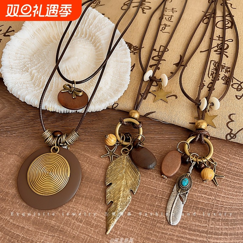 新中式禅意古铜羽毛项链女波西米亚民族风双层叠戴长款毛衣链配饰