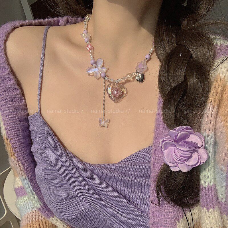 紫色串珠项链~春季新款!甜酷蝴蝶花朵爱心吊坠锁骨链2025年颈链