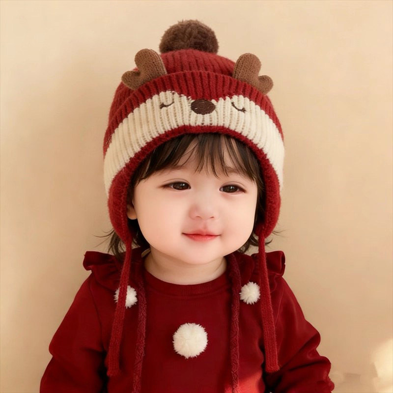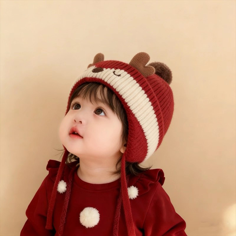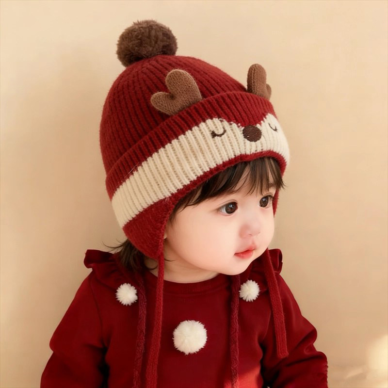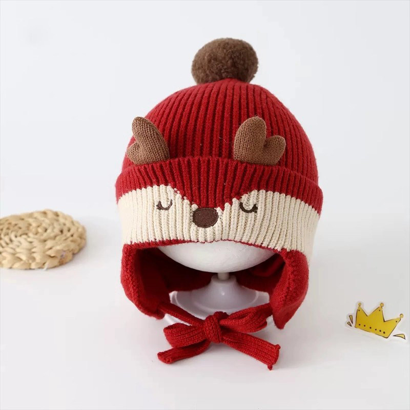 宝宝帽子秋冬季新年红色男女童保暖针织护耳帽加厚婴儿冬天毛线帽