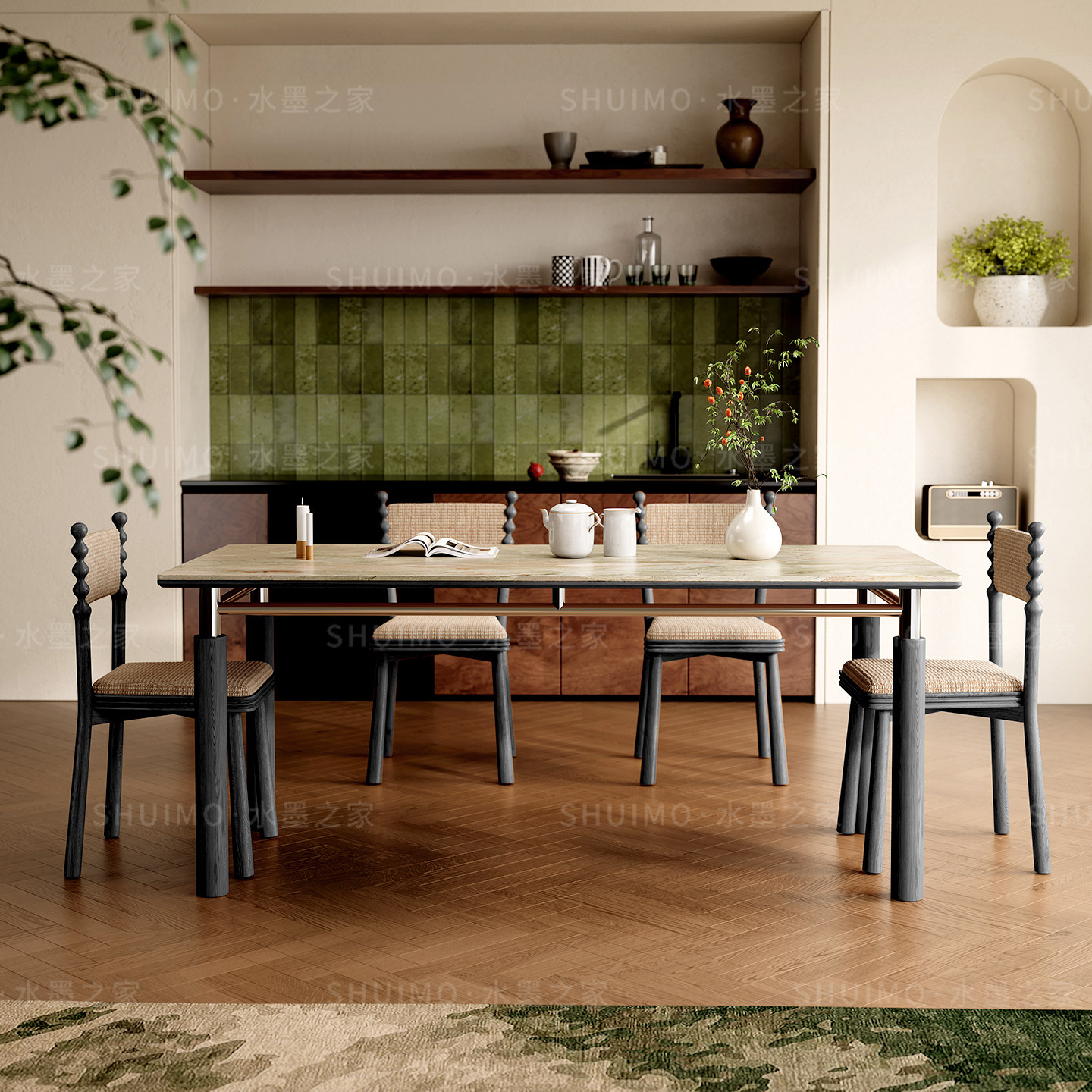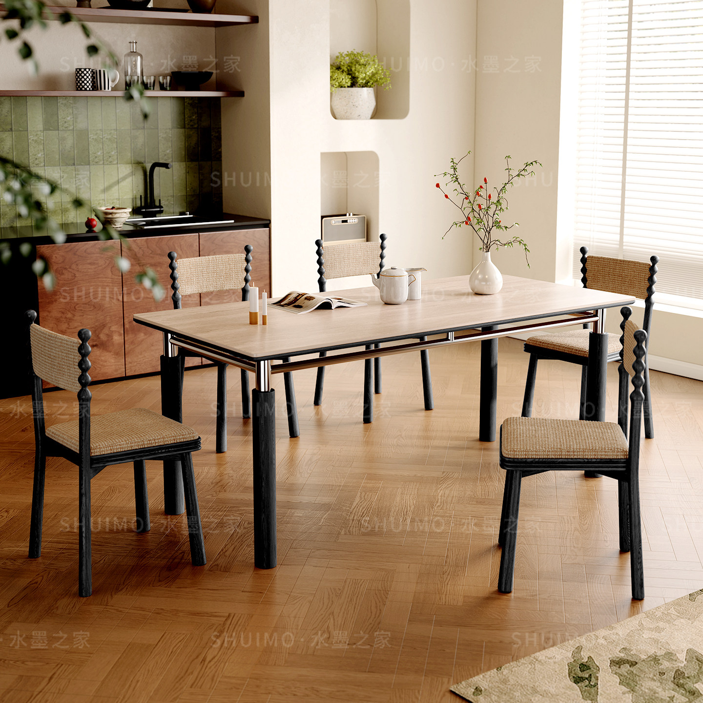 包豪斯德利丰岩板餐桌椅洞石中古风不锈钢白蜡木实木四季岩板餐桌