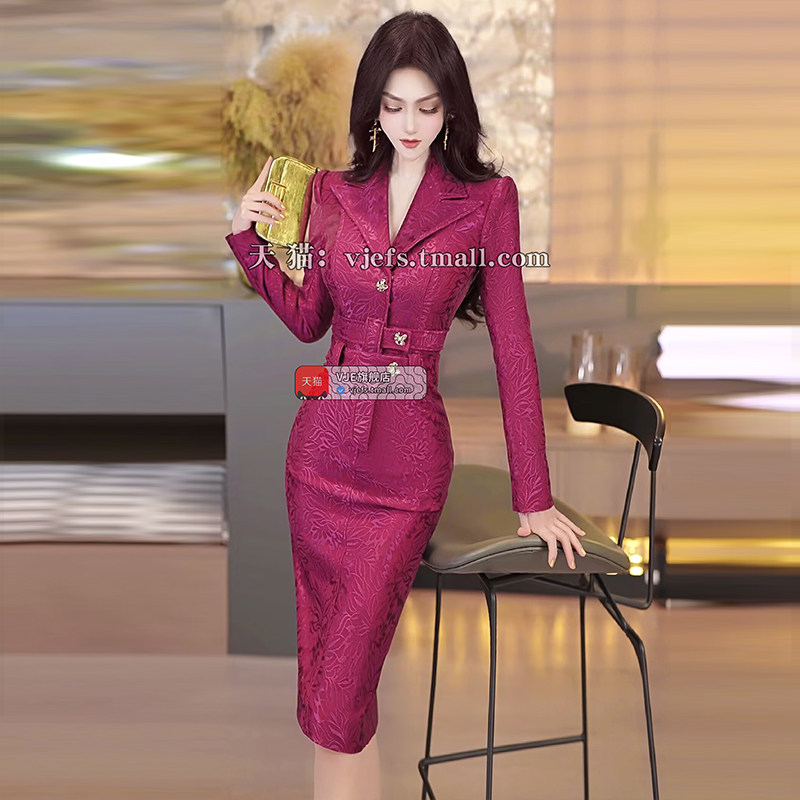 VJE开春时尚印花名媛风收腰包臀裙2025新款法式女人味西装连衣裙