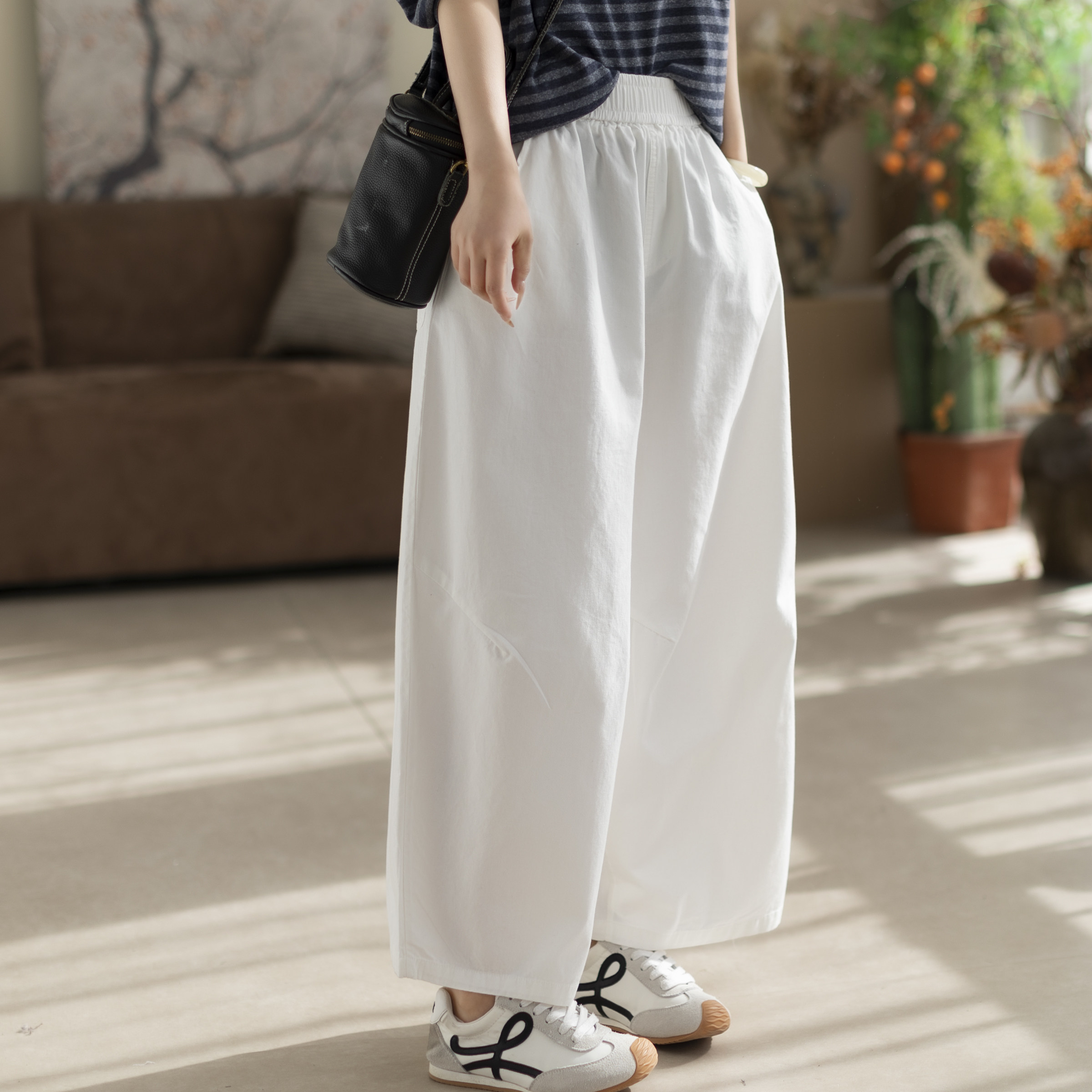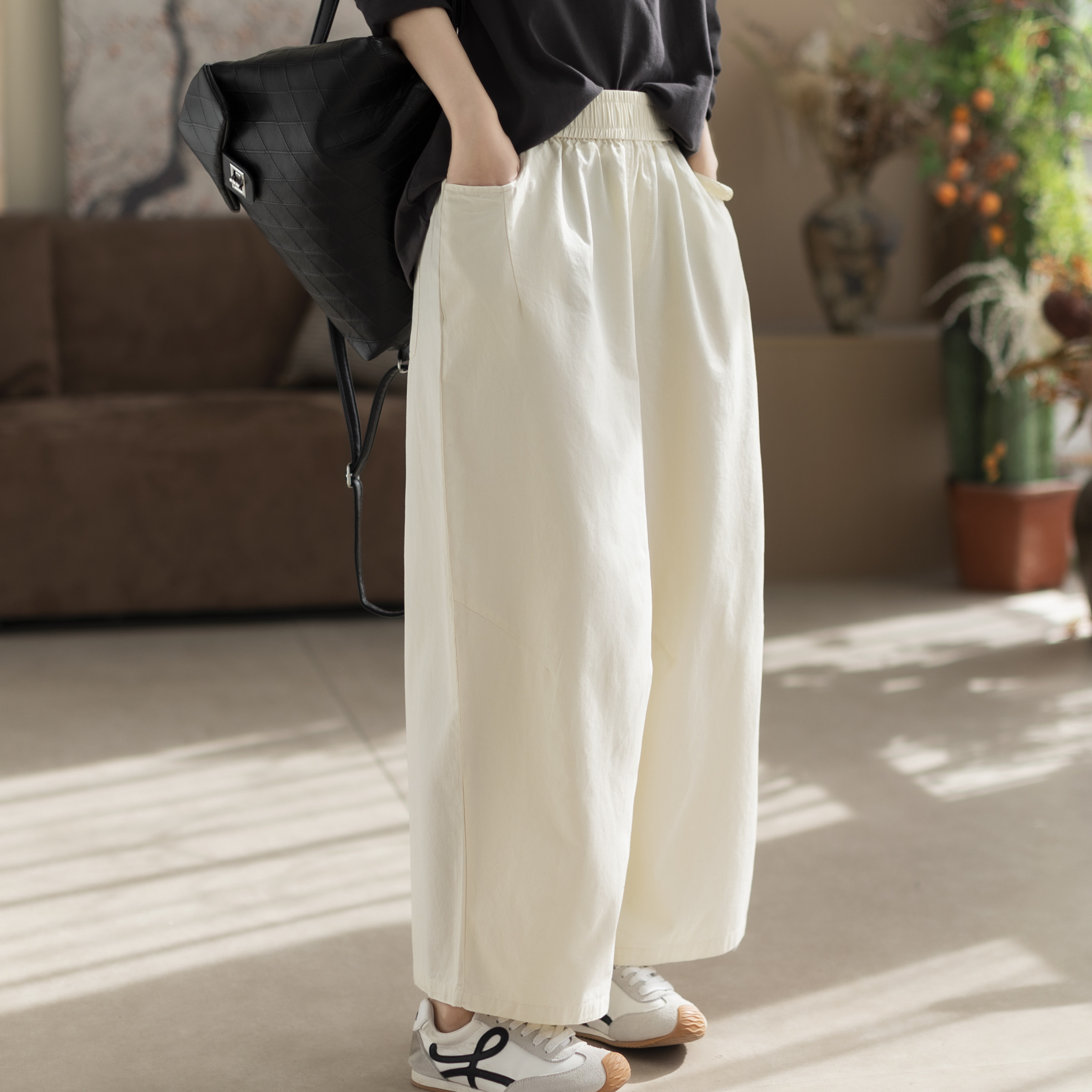 咖咪羽全棉休闲裤女春秋新款直筒纯色女士高腰阔腿显瘦女装裤子