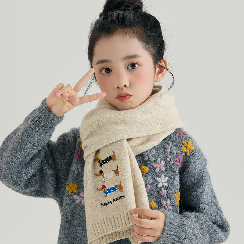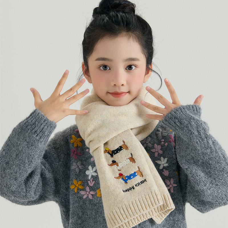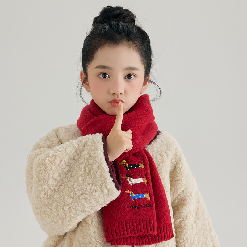儿童新年红色围巾女孩男孩秋冬针织加厚保暖卡通图案红色羊毛围脖