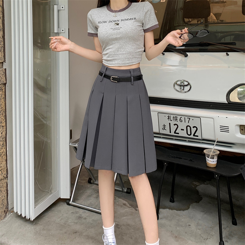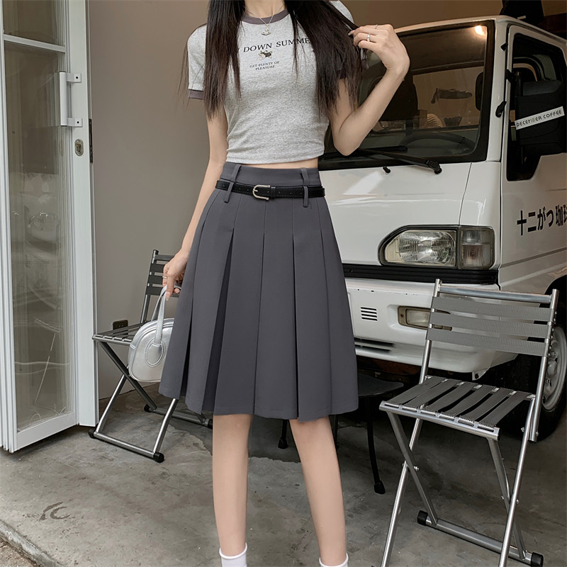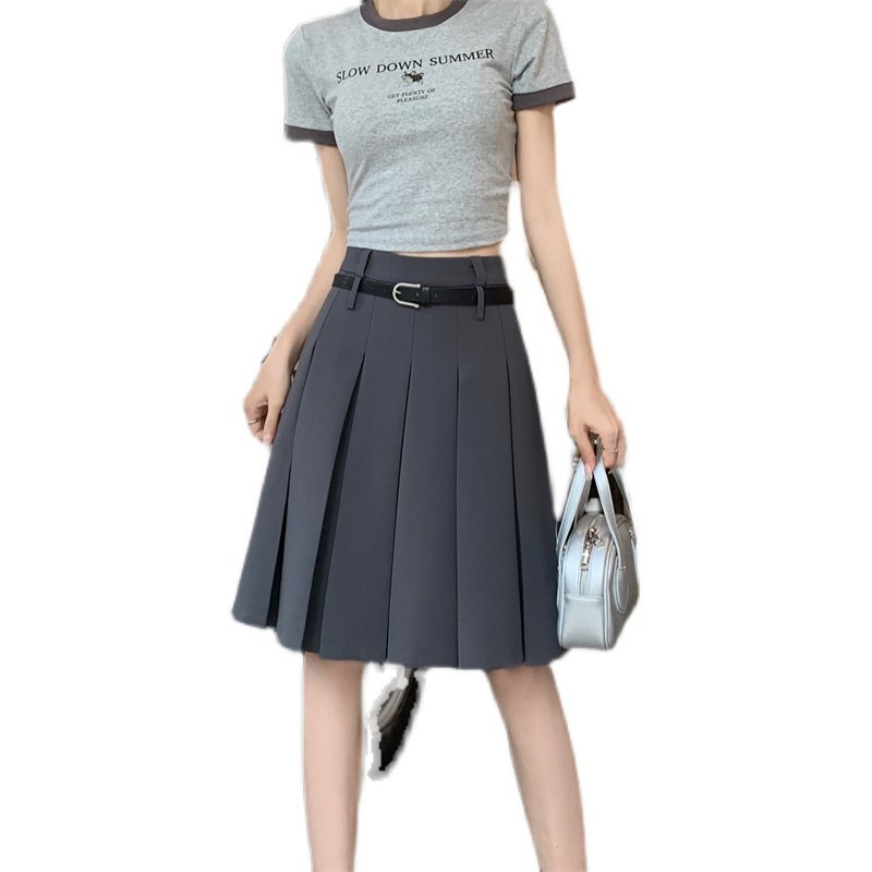 大码灰色西装中长半身裙女夏季设计感小众A字裙高腰西装百褶裙子