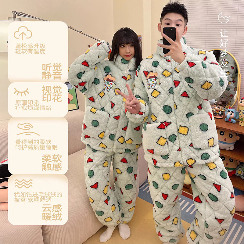 【蓄热型】蜡笔小新三层夹棉情侣睡衣女秋冬季珊瑚绒加厚男家居服