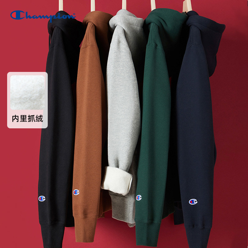 Champion冠军加绒卫衣男秋冬情侣连帽加厚美式风女红色休闲上衣冬