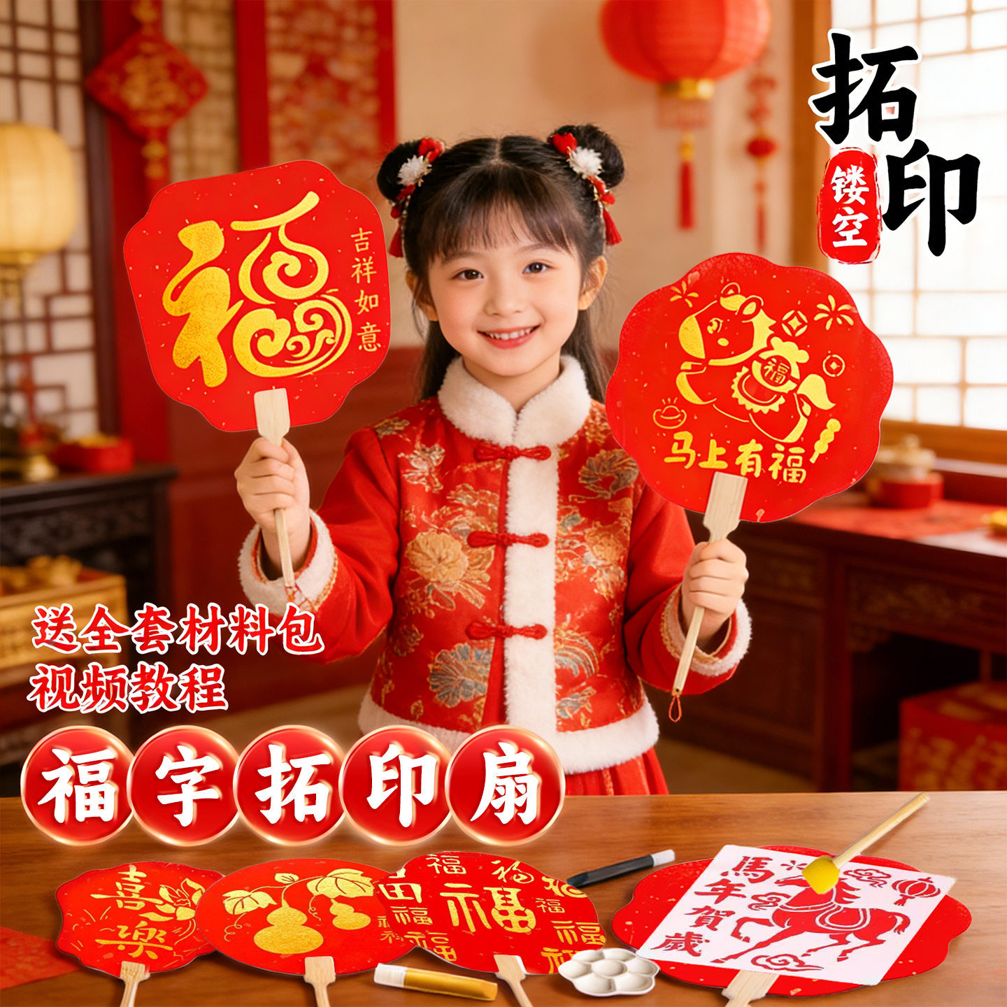 非遗拓印工具模板diy扇子材料包新年元旦礼物幼儿园儿童亲子活动社区暖场手工制作新款书法团扇专用拓包套装6