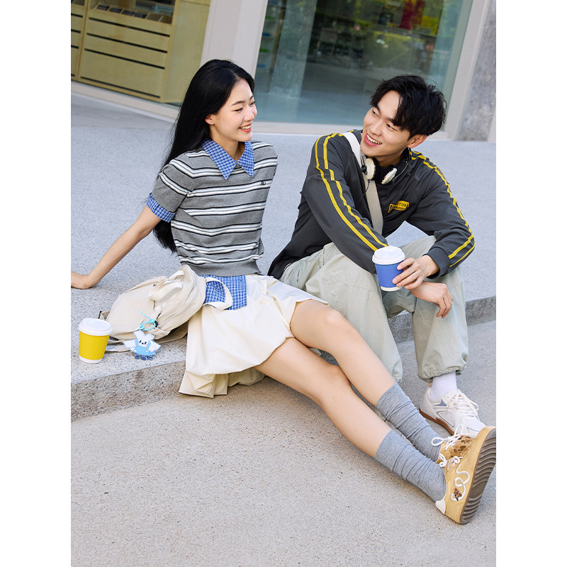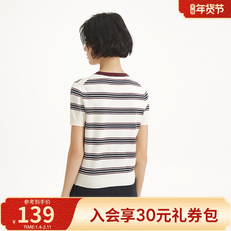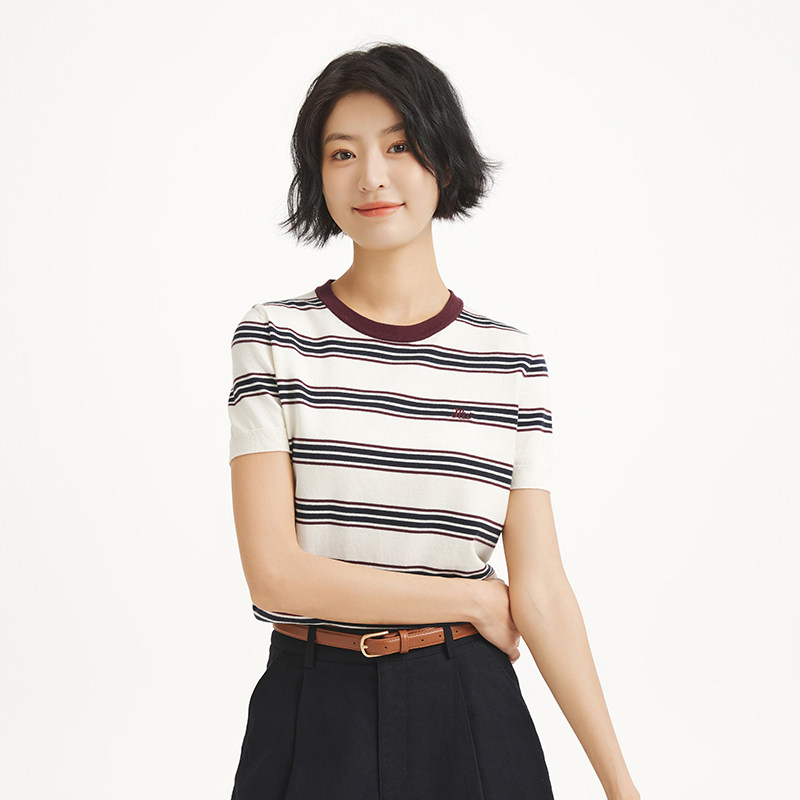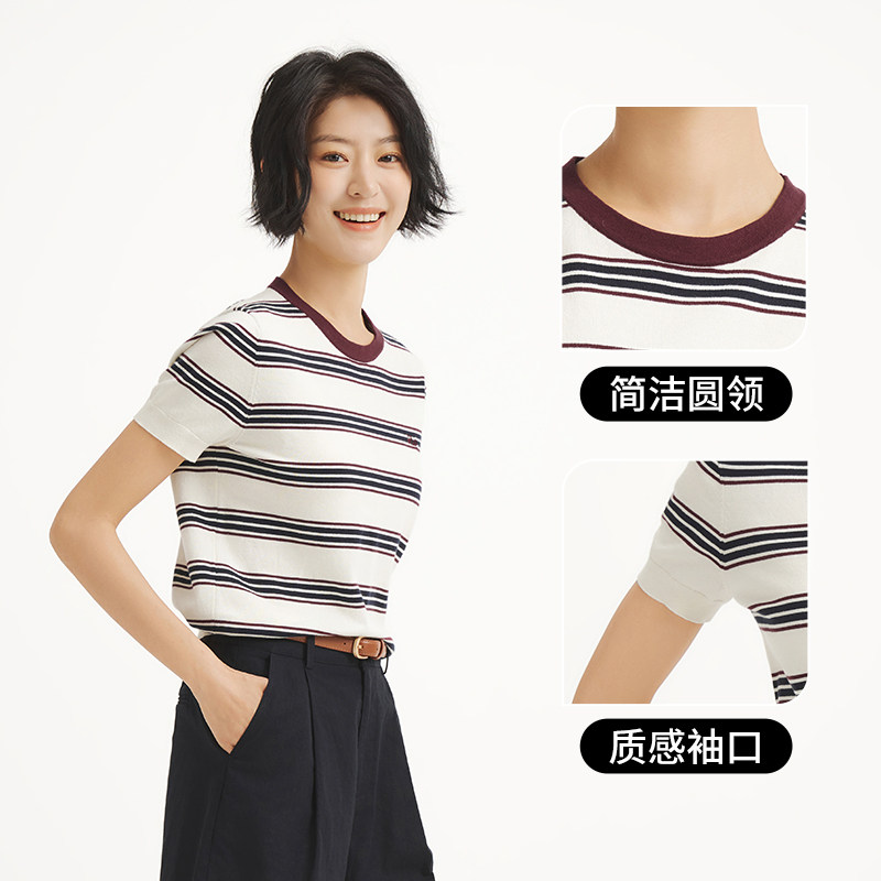 热风2025年秋季新款女士修身条纹针织衫简约优雅低圆领短袖