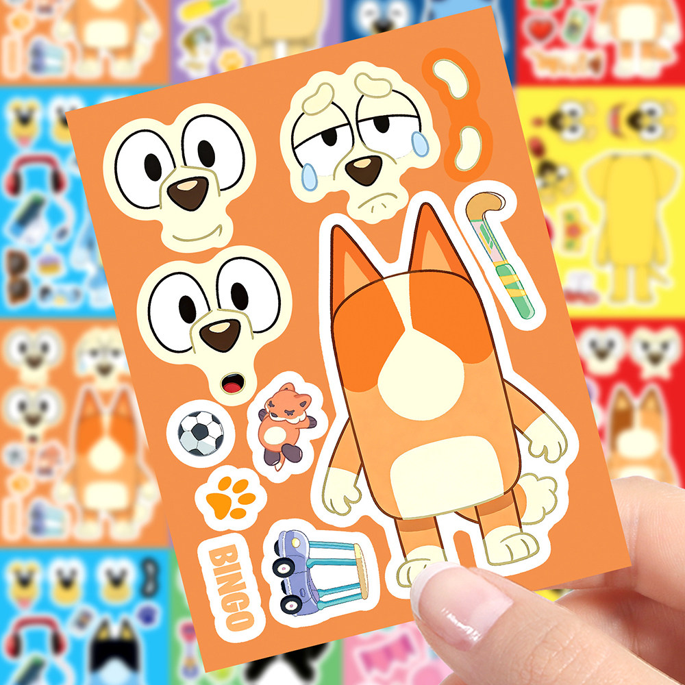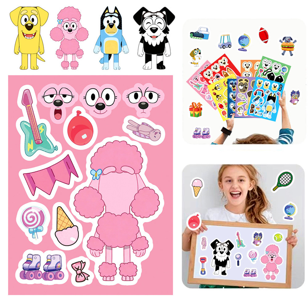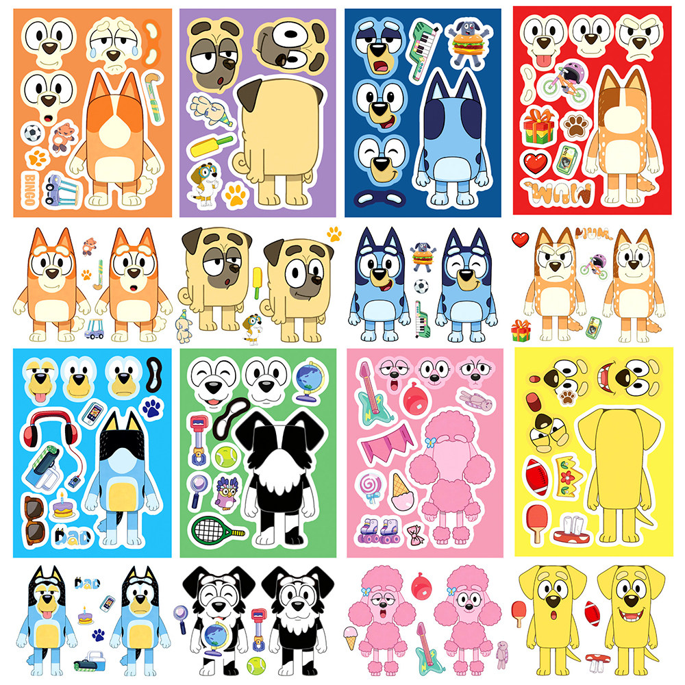 16张BIuey布鲁伊拼图贴纸卡通儿童玩具可爱趣味换脸手工拼贴贴画
