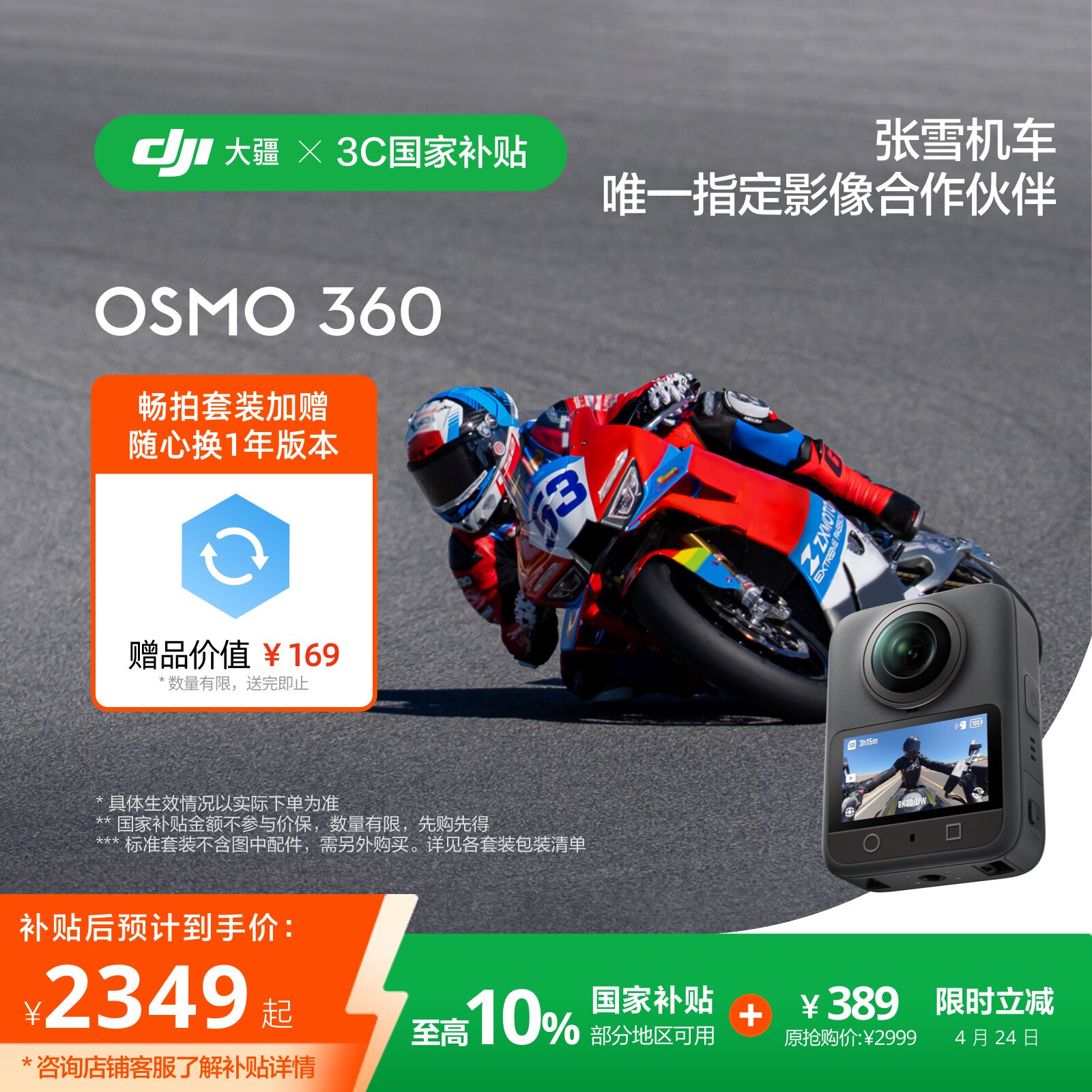 【张雪同款】国家补贴大疆 Osmo 360全景运动相机8K骑行 105G内存