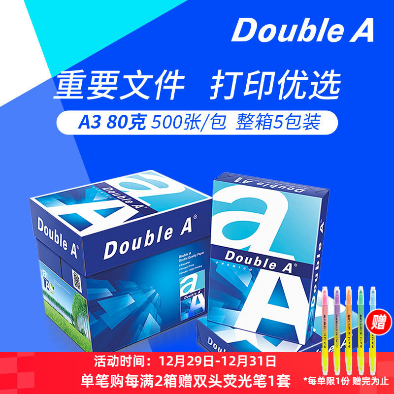 Double A达伯埃80g500张A4 A3复印纸a4打印纸双面不易卡纸办公用品打印加厚整箱批发多省包邮开发票
