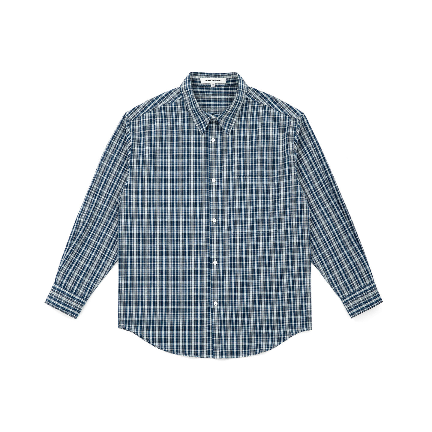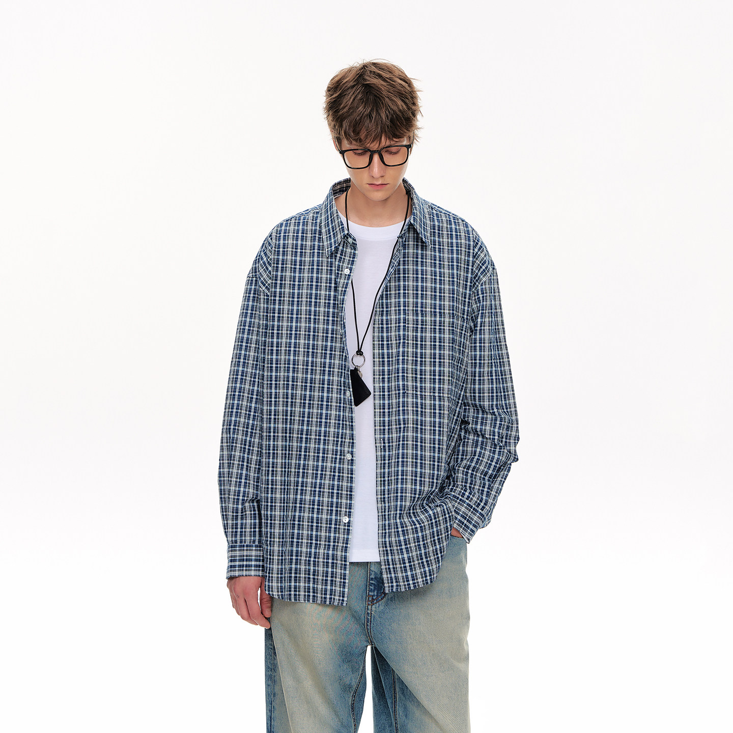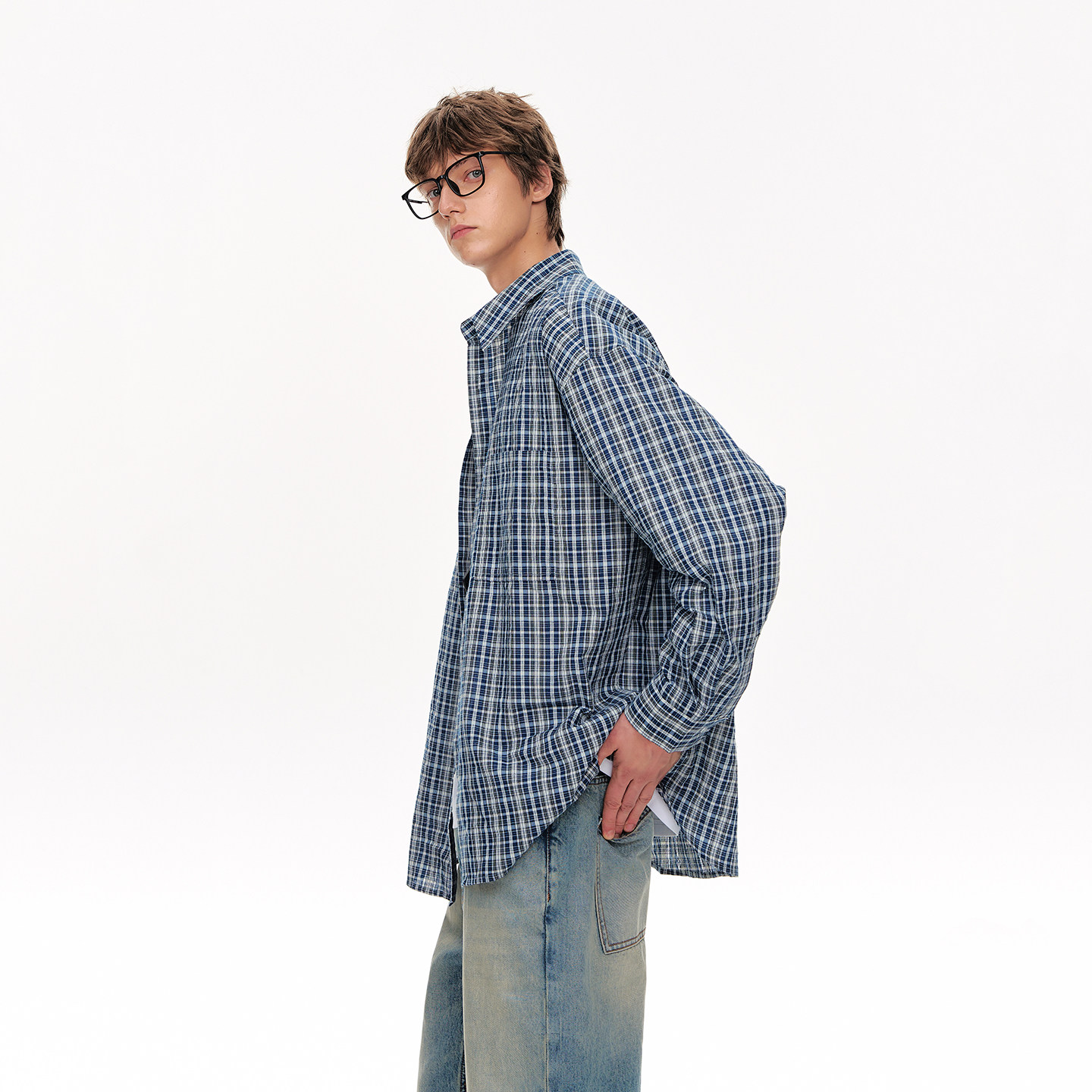 CLIMAX VISION慵懒松弛感微皱肌理泡泡蓝格纹休闲复古长袖衬衫