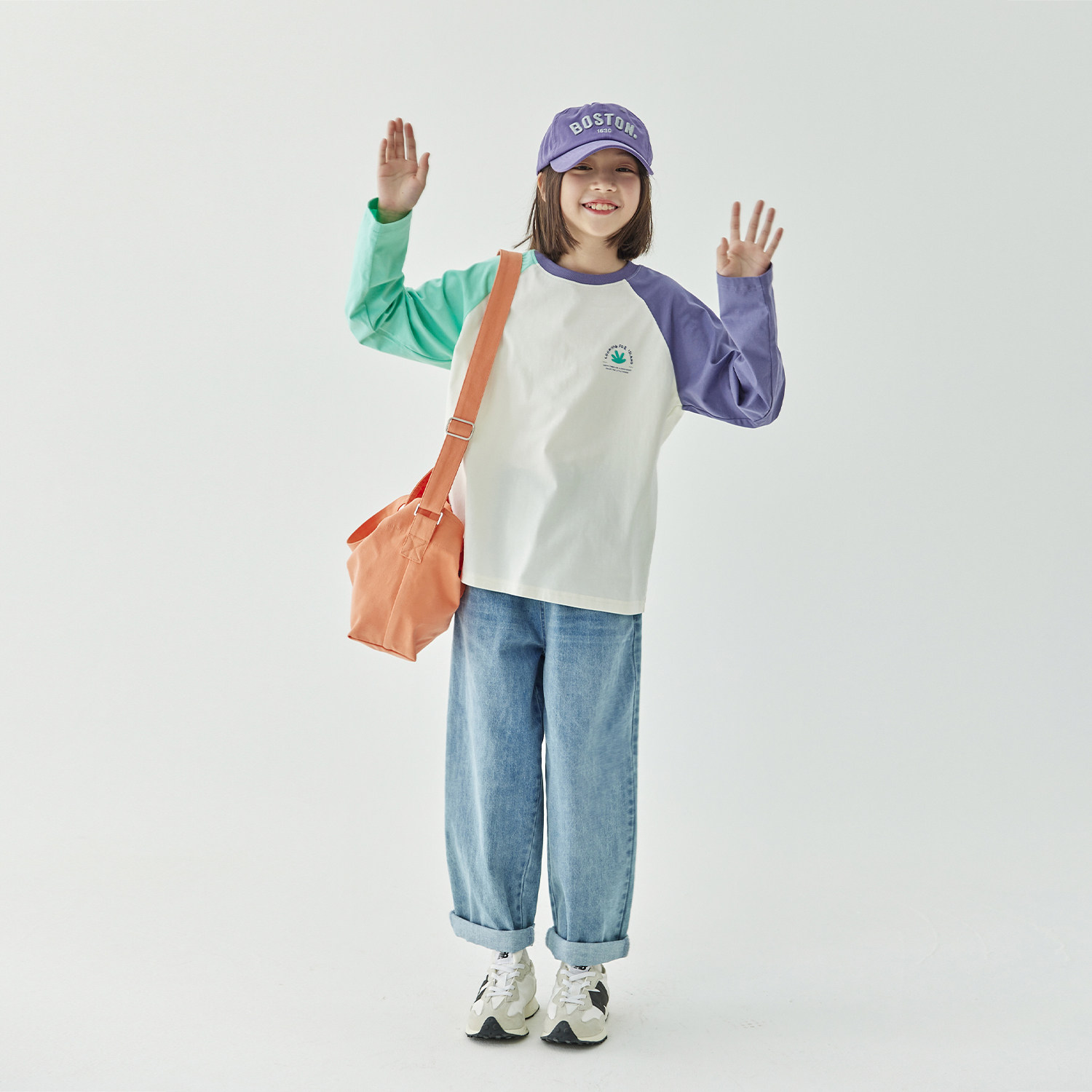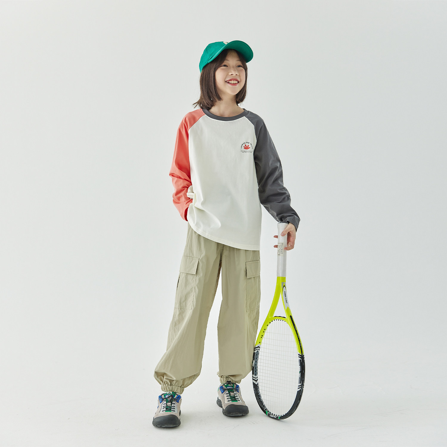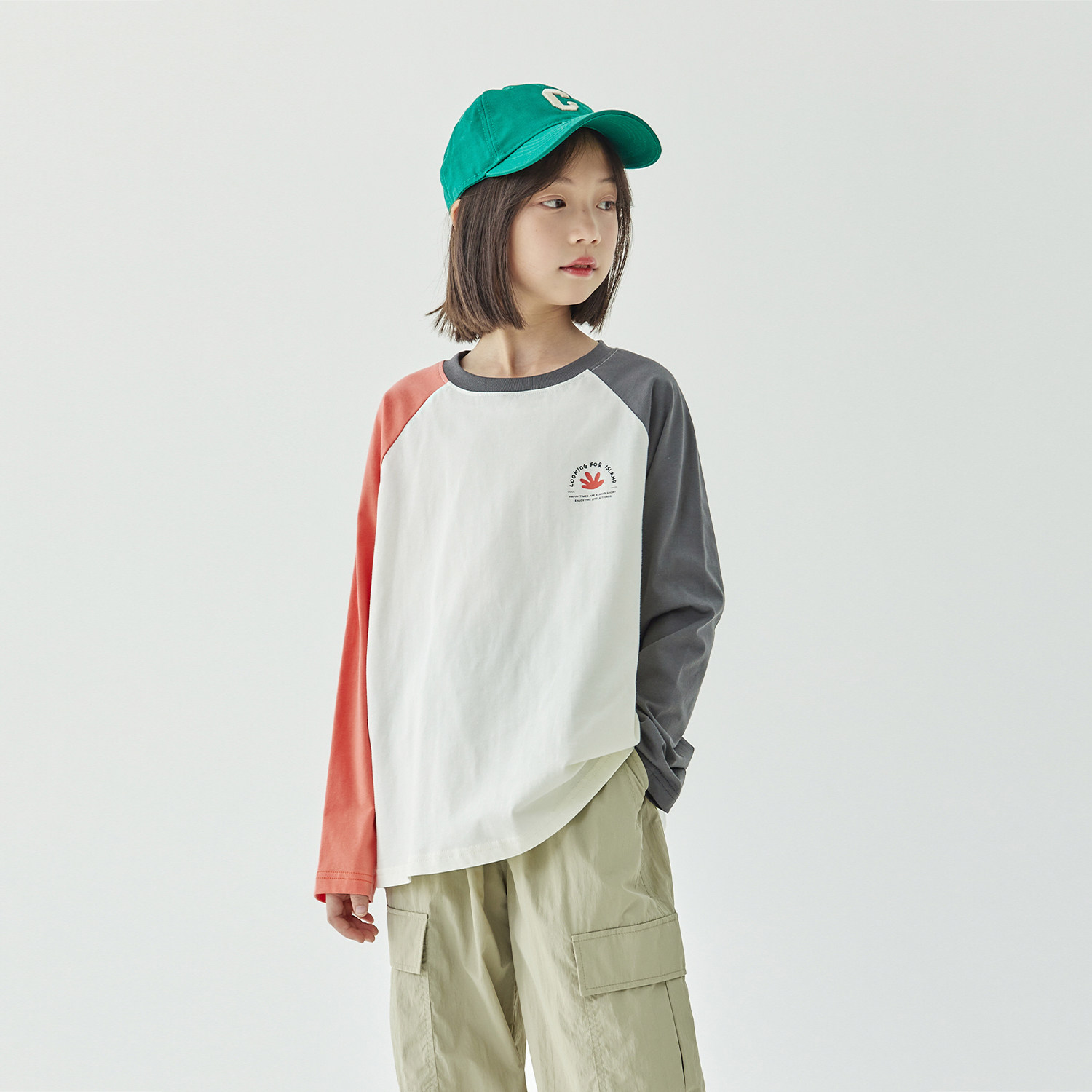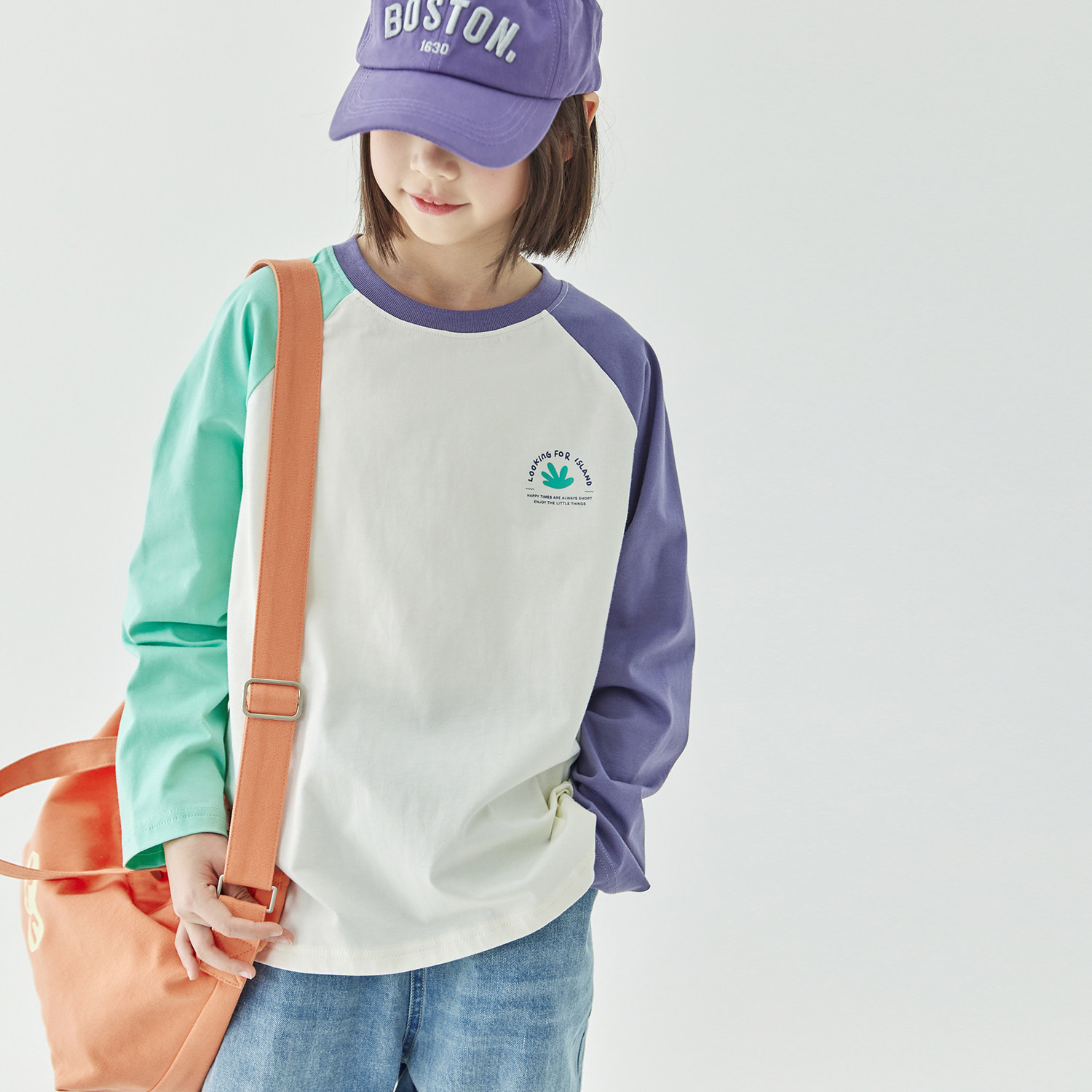 棵初2025年秋冬女童撞色插肩袖T恤亲子款全棉百搭圆领宽松上衣