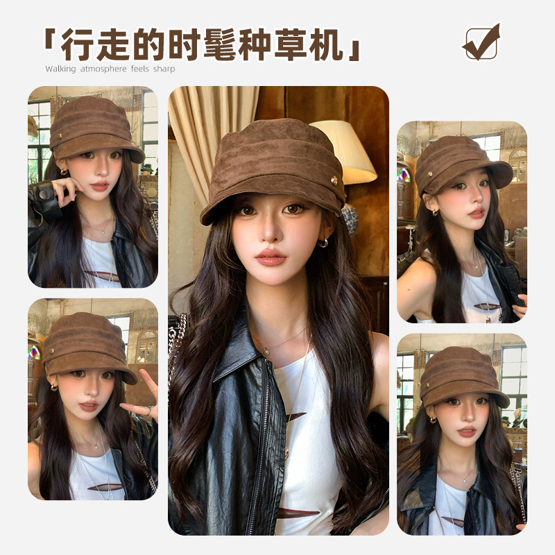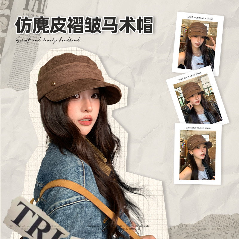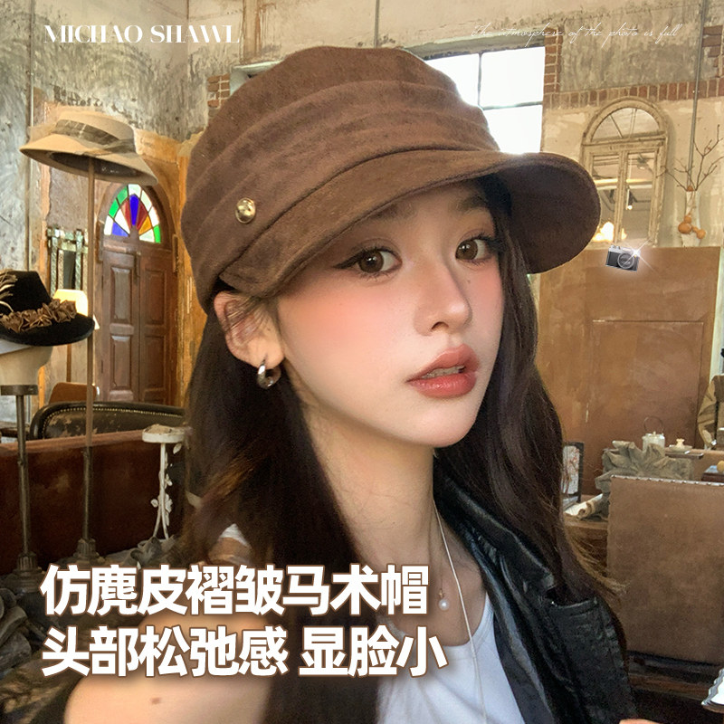 褶皱马术帽女秋季平顶贝雷帽子显脸小2025新款时尚洋气画家帽流行