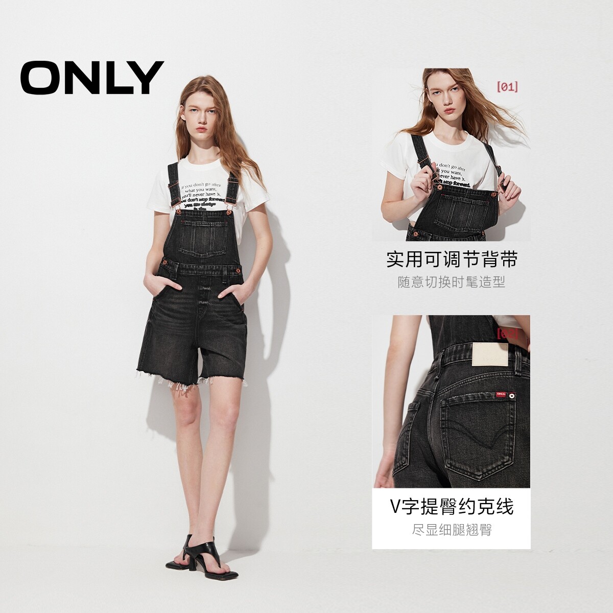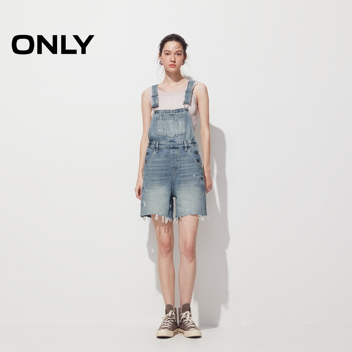 【ONLY奥莱】春夏新款复古做旧毛边高腰背带裤短裤牛仔裤女