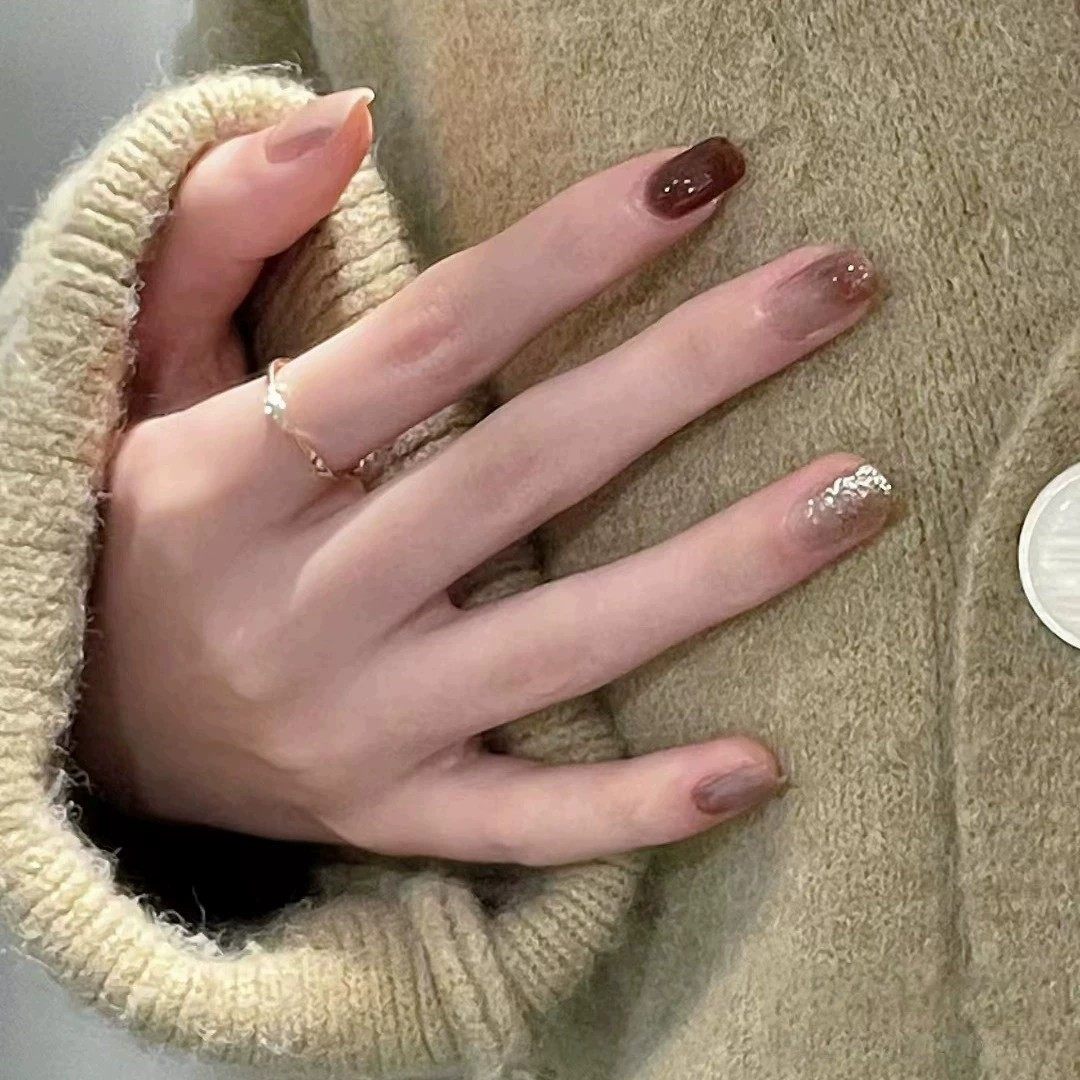 穿戴式美甲秋冬新款高级感显白短款纯欲裸色渐变猫眼指甲贴片法式
