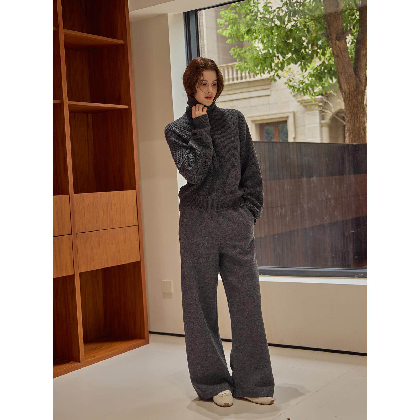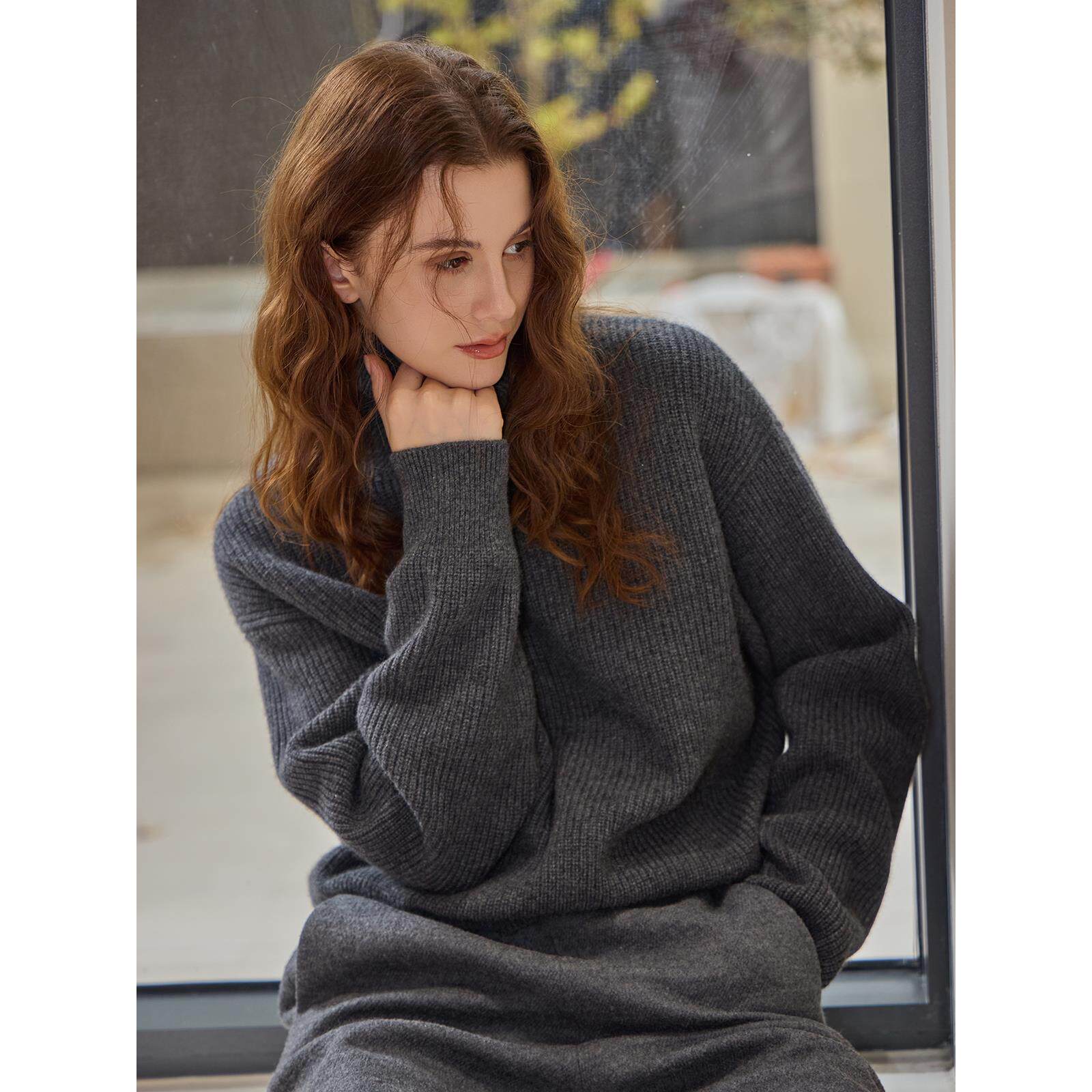 GOBI戈壁秋冬纯色宽松绞花翻领高领羊绒女士毛衣针织衫WK666