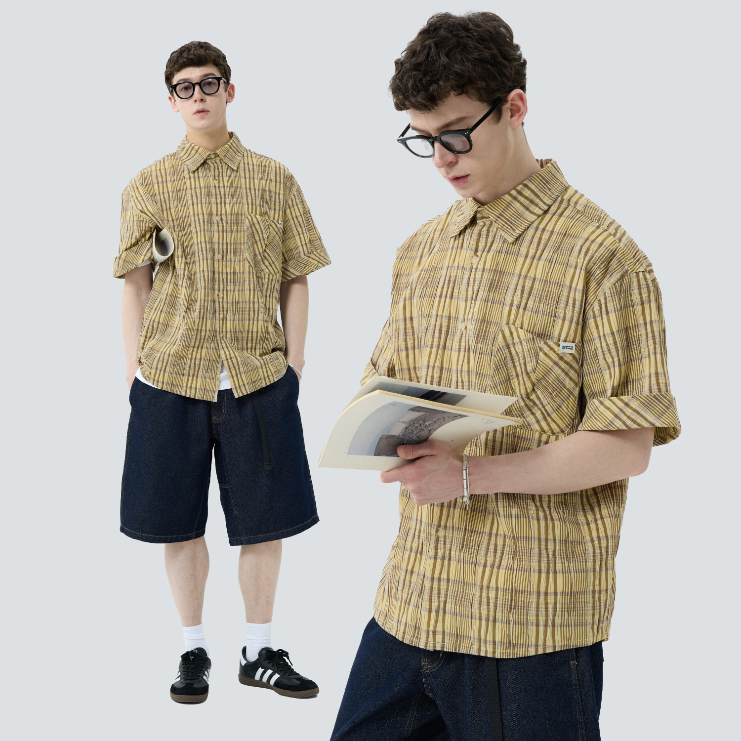 warmtrees2025夏季新款 度假休闲亚麻色格子泡泡布短袖衬衫