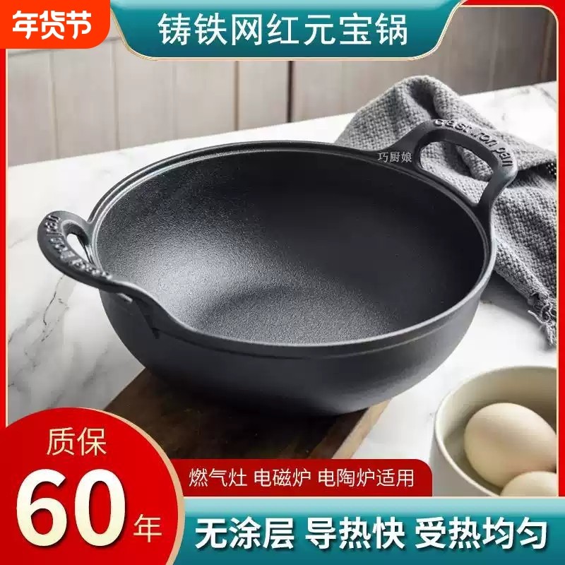 铸铁元宝锅小钢炮双耳炖锅炒锅不粘锅电磁炉燃气通用无涂层平底锅
