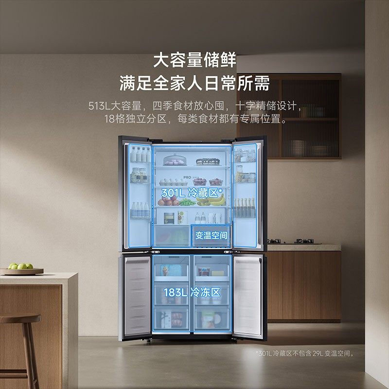 小米米家Pro双系统冰箱513L十字四门60cm超薄风冷无霜一级能效