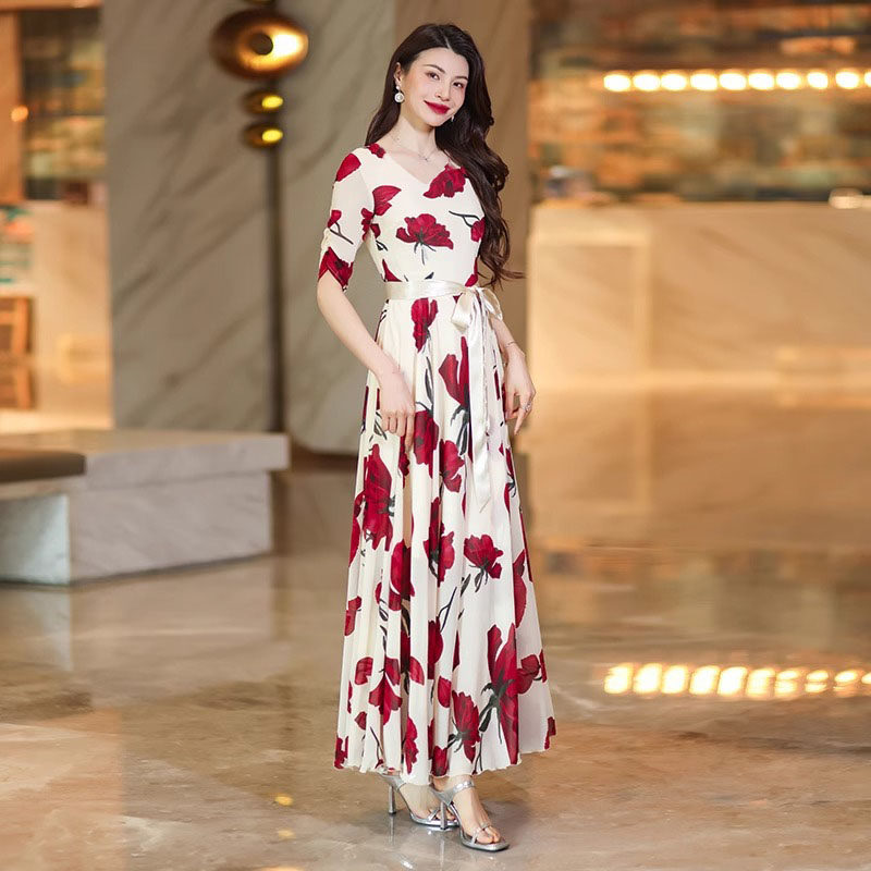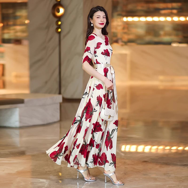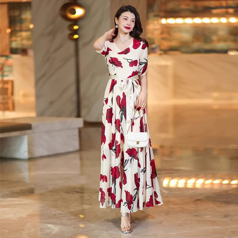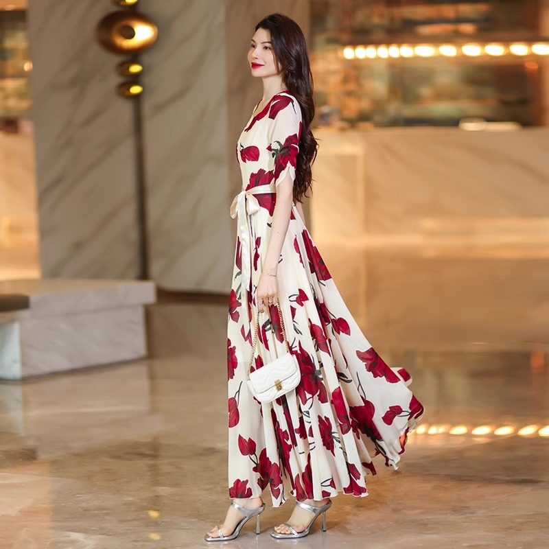 2025夏穿搭连衣裙高级感显瘦阔太太雪纺裙子女夏长款碎花连身裙