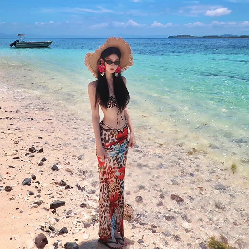 新款性感辣妹豹纹印花图案欧美系绳三点式比基尼分体泳衣沙滩度假