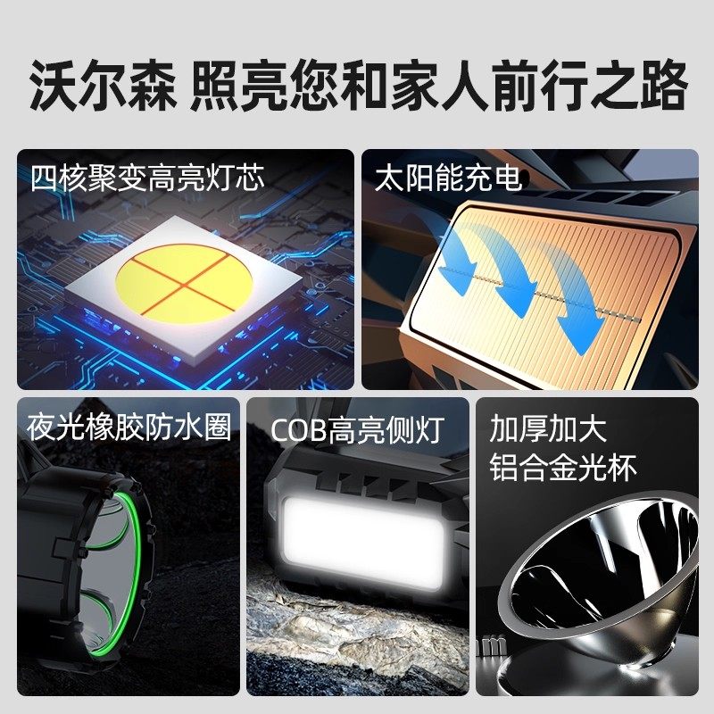 沃尔森强光手电筒超亮户外远射太阳能手电筒手提探照灯家用led