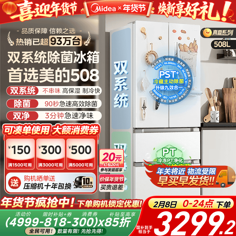 【双系统】美的508法式多门双开四门白色大容量家用冰箱风冷无霜