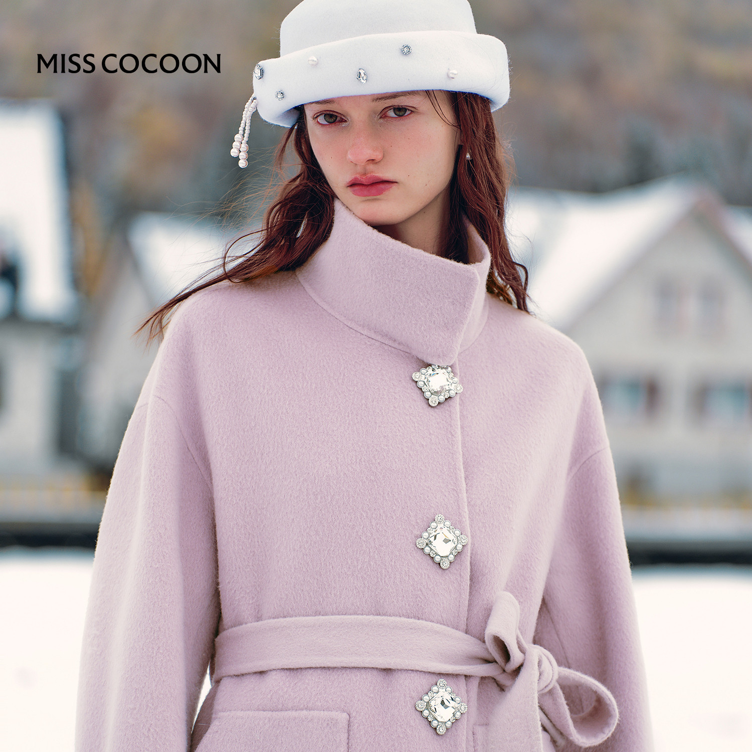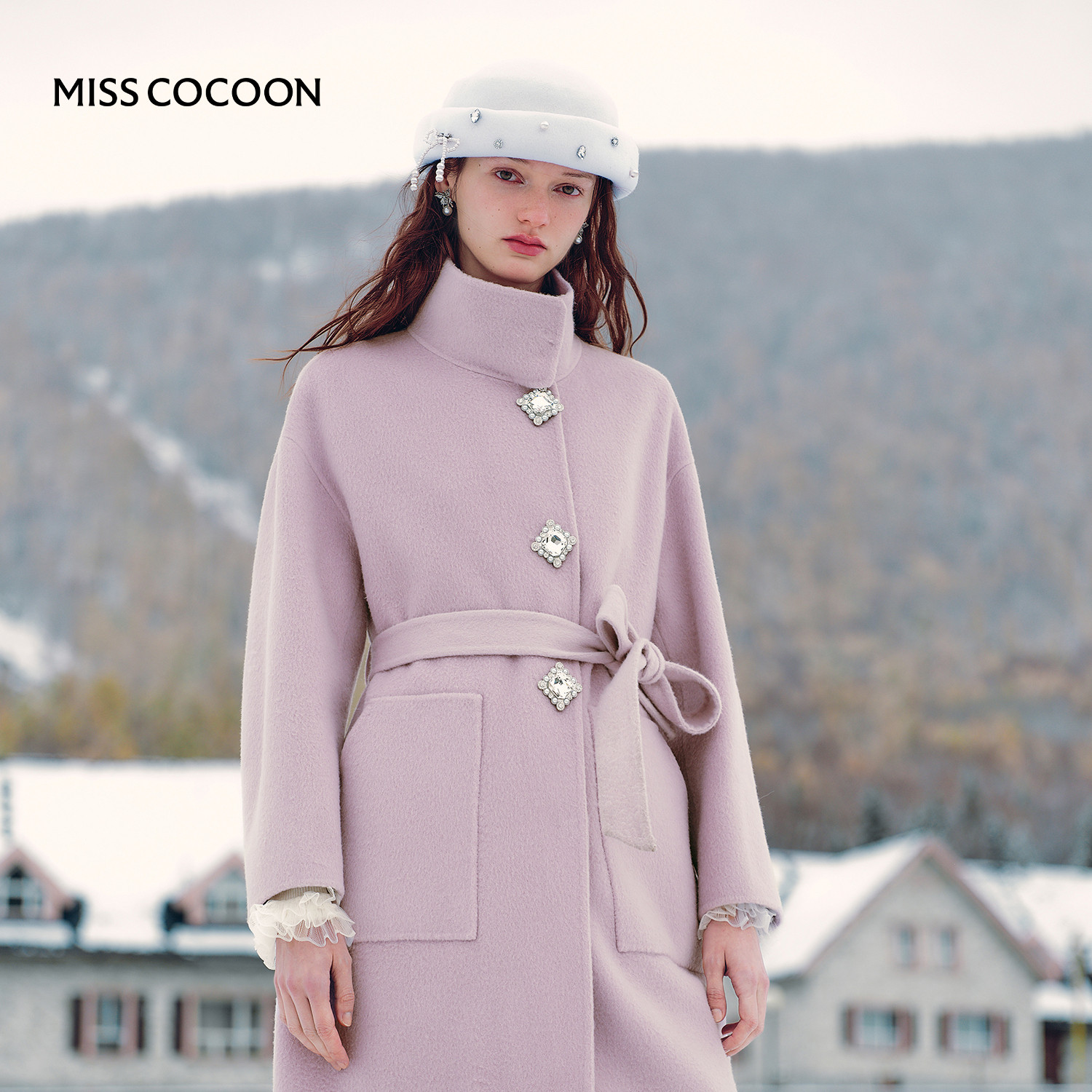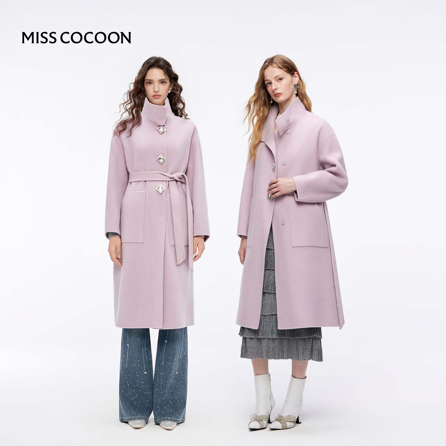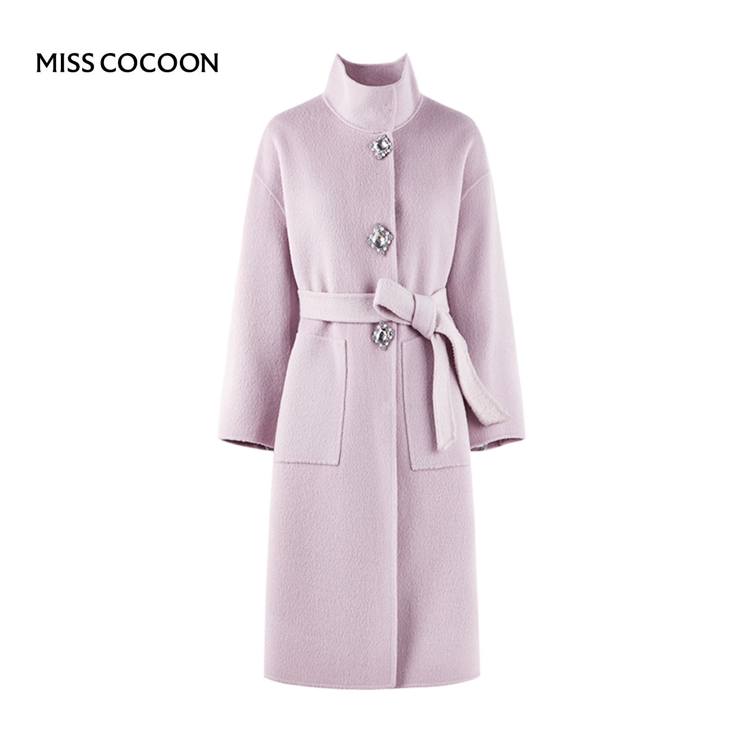 MISSCOCOON可可尼长款大衣女2025秋冬新款紫色绵羊毛立领毛呢外套
