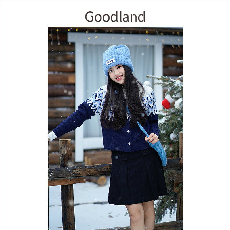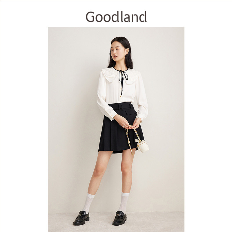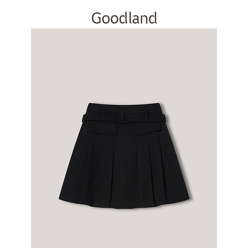 Goodland美地春季法式优雅百褶减龄小黑裙羊毛A字半身裙