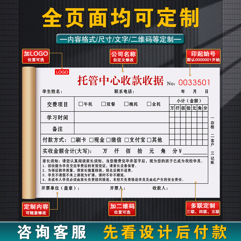 【托管中心培训专用】票据二联校外托辅入学单据学员报名收据本教育机构早晚托票据学生辅导班课程作业协议单