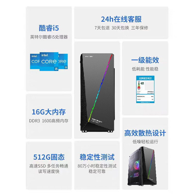 电商 客服多开接待专用台式电脑i5/16G/512G组装机电脑主机全套