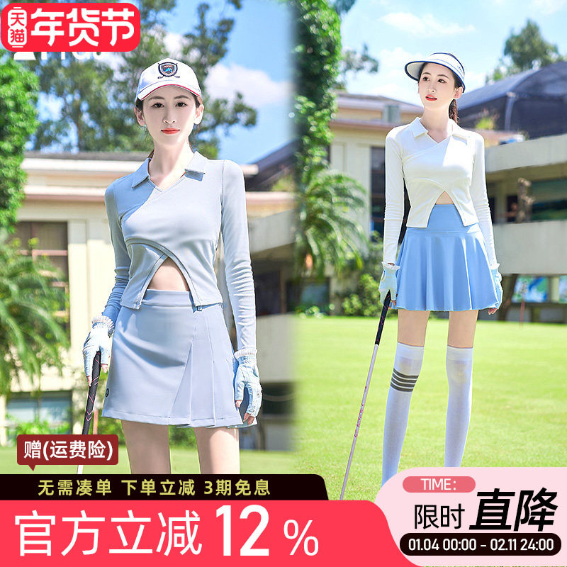 高尔夫球女士长袖T恤衫V领翻领高腰开叉弹力修身显瘦运动上衣服装