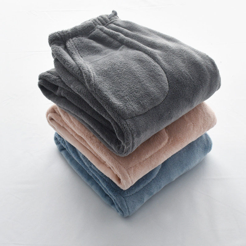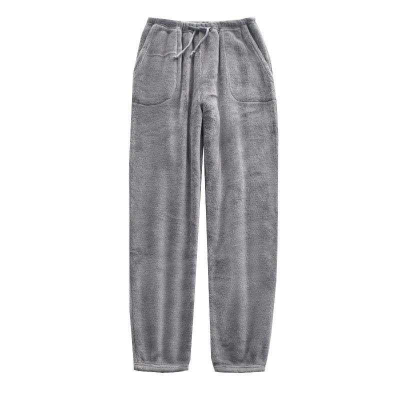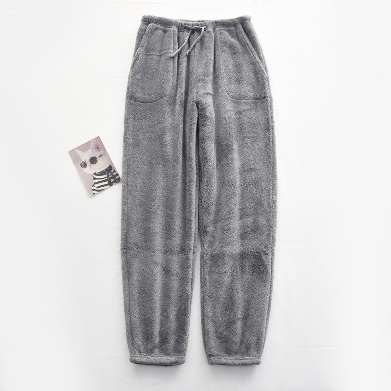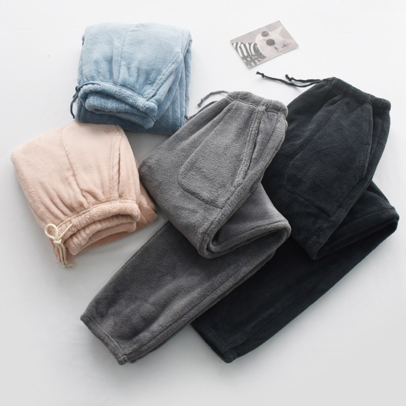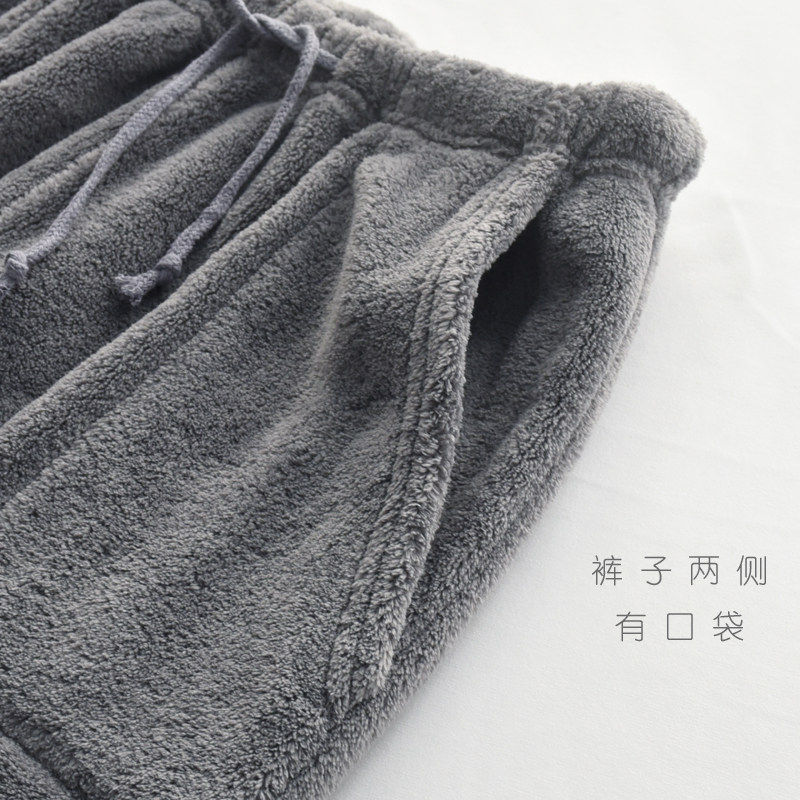 红豆纯色简约睡裤男女秋冬季珊瑚绒加厚保暖系绳收口情侣家居裤长