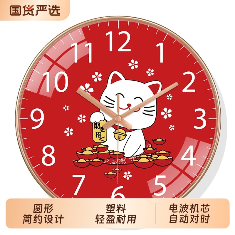 客厅自动对时钟表时钟中国风创意招财猫家用挂墙新中式挂钟静音