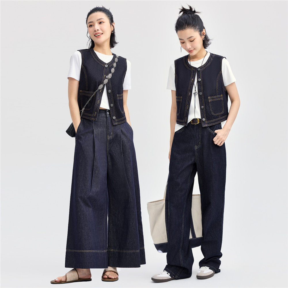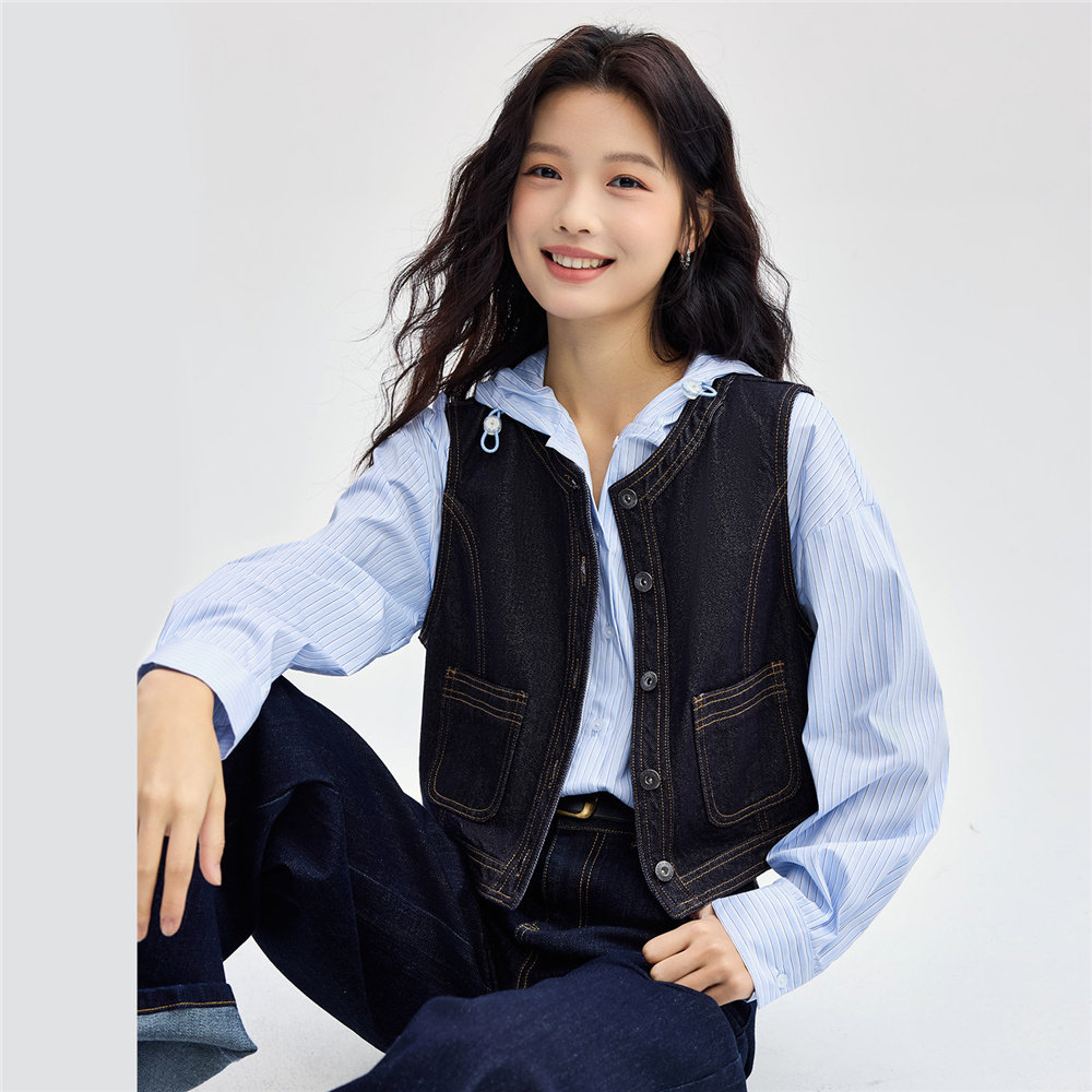 设计师款佐丹奴洗水不易褪色明线圆领短款牛仔马甲背心女18374902