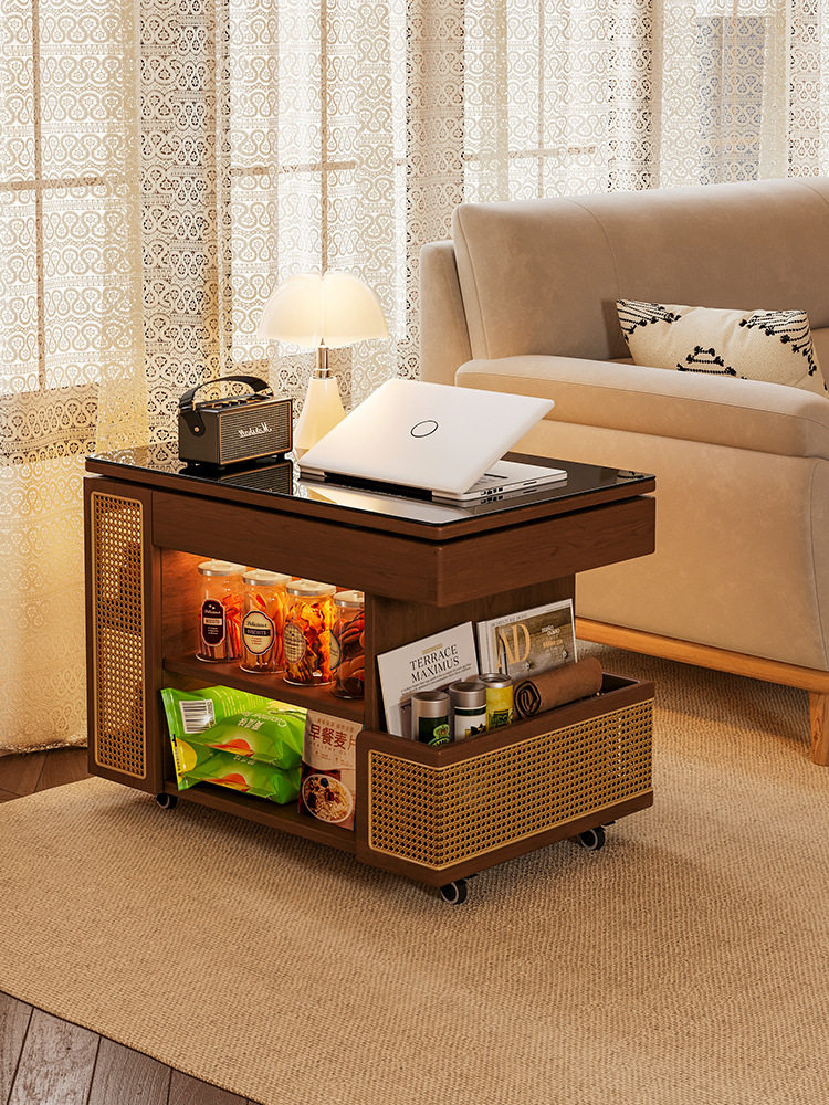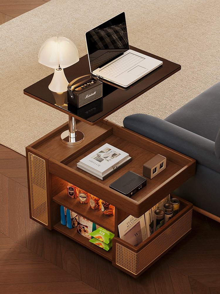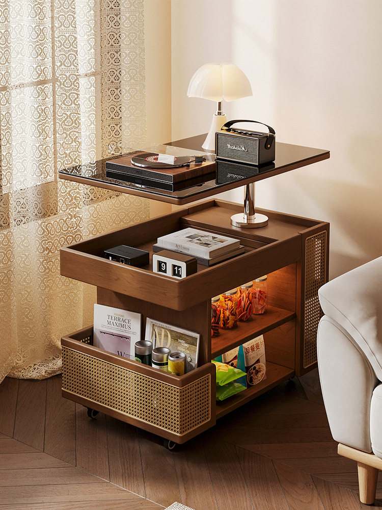 实木可移动边几巴士升降茶几家用客厅沙发边柜子中古风小推车边几