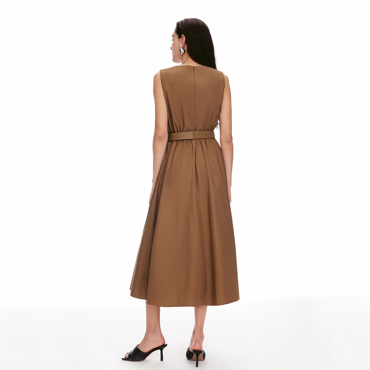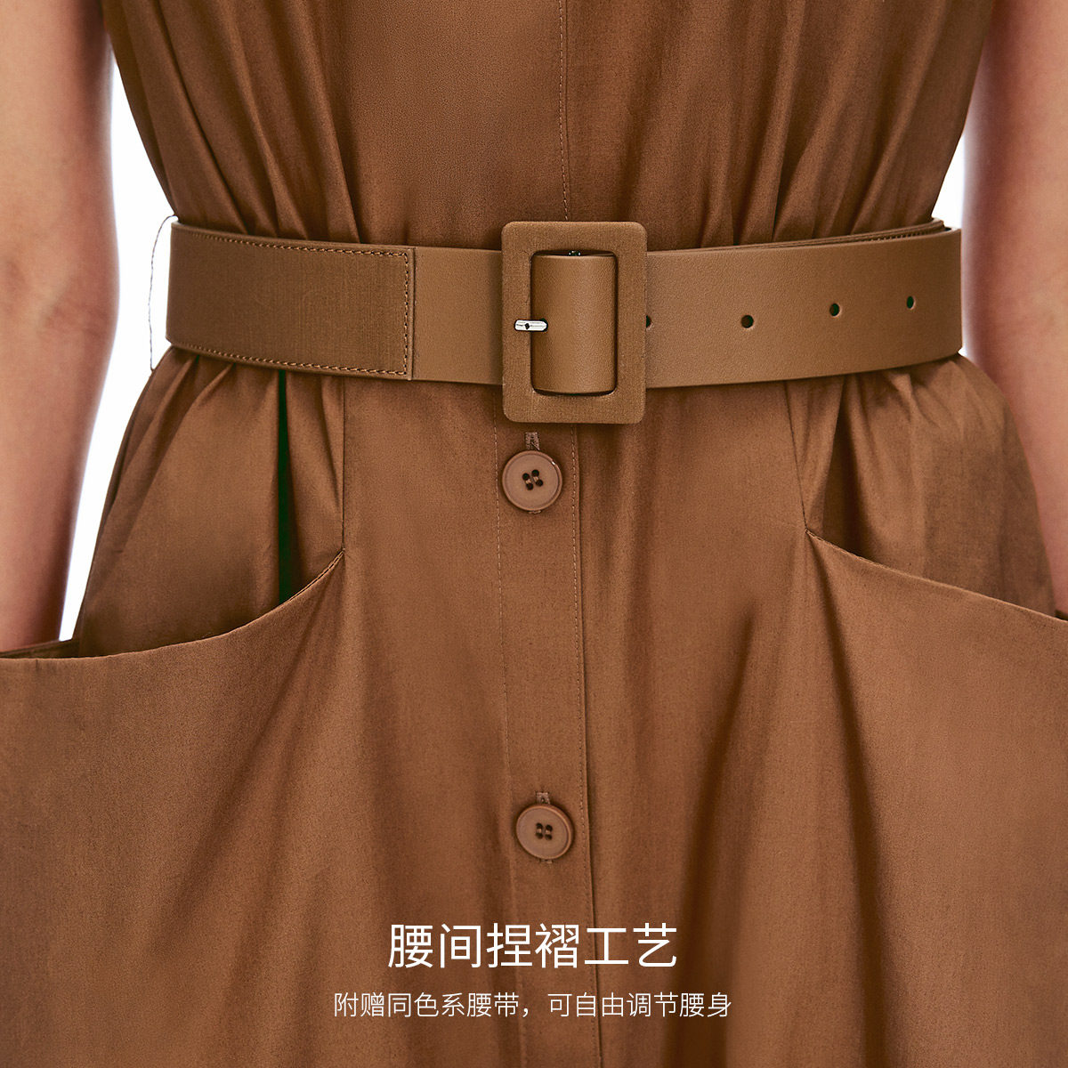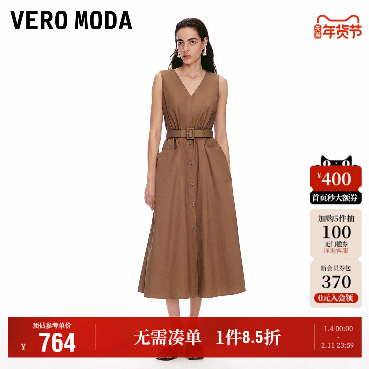 Vero Moda奥莱连衣裙2025秋冬新款纯棉V领捏褶同色腰带长裙时尚