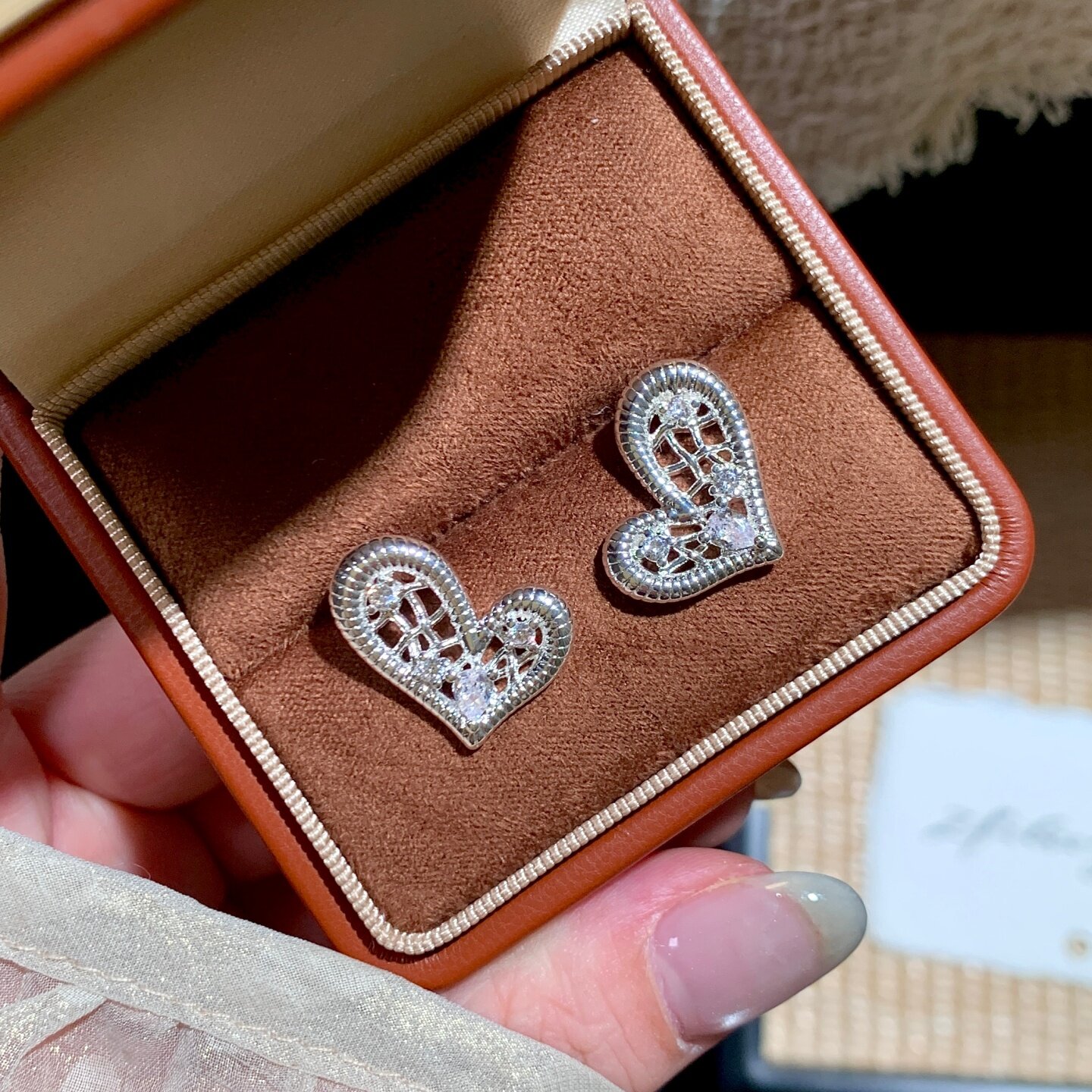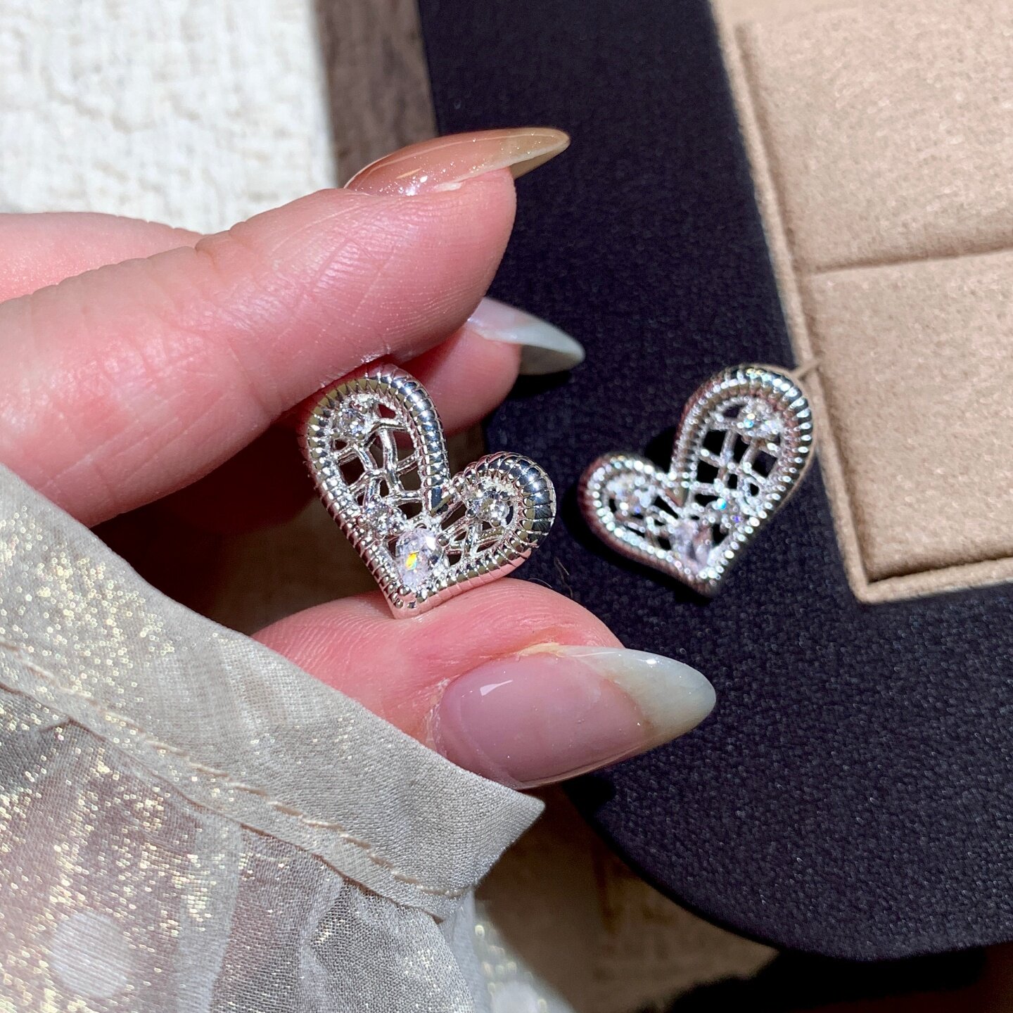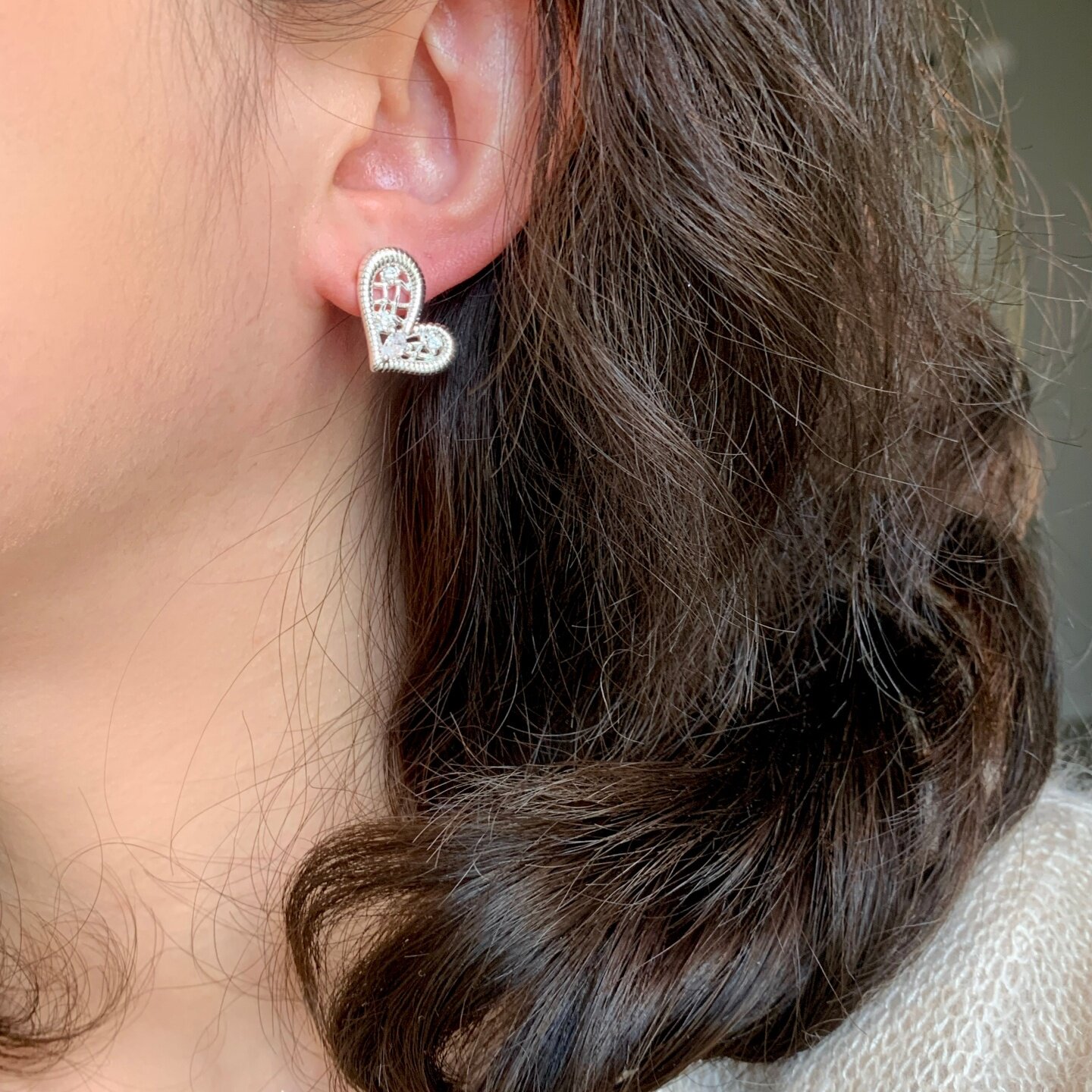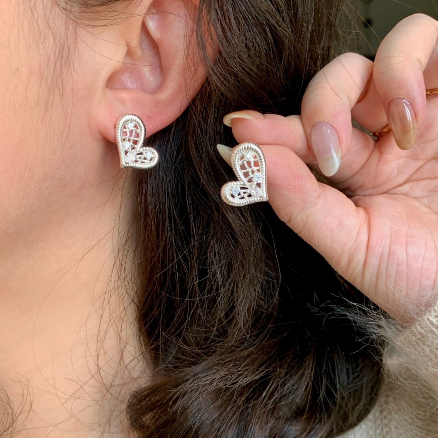 《怦然心动》轻奢法式银色蕾丝镂空镶钻爱心阻力耳夹耳饰耳钉耳环