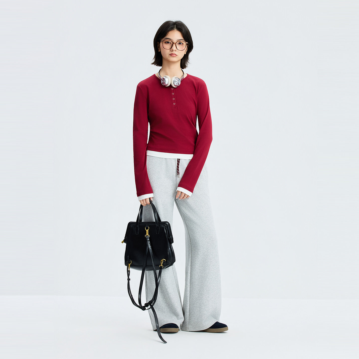 三福打底衫女2026新款春季简约纯色收腰V领修身休闲长袖上衣女装