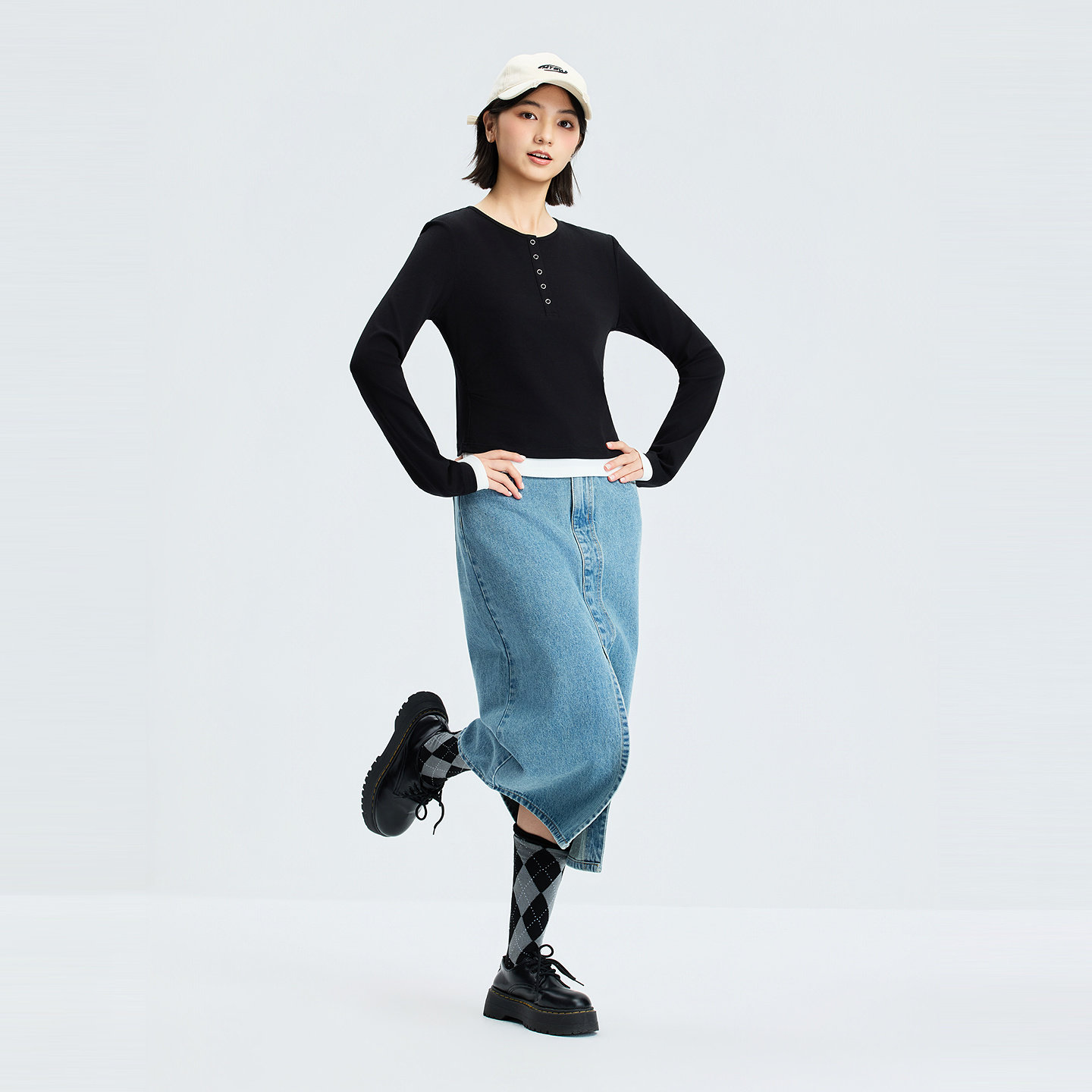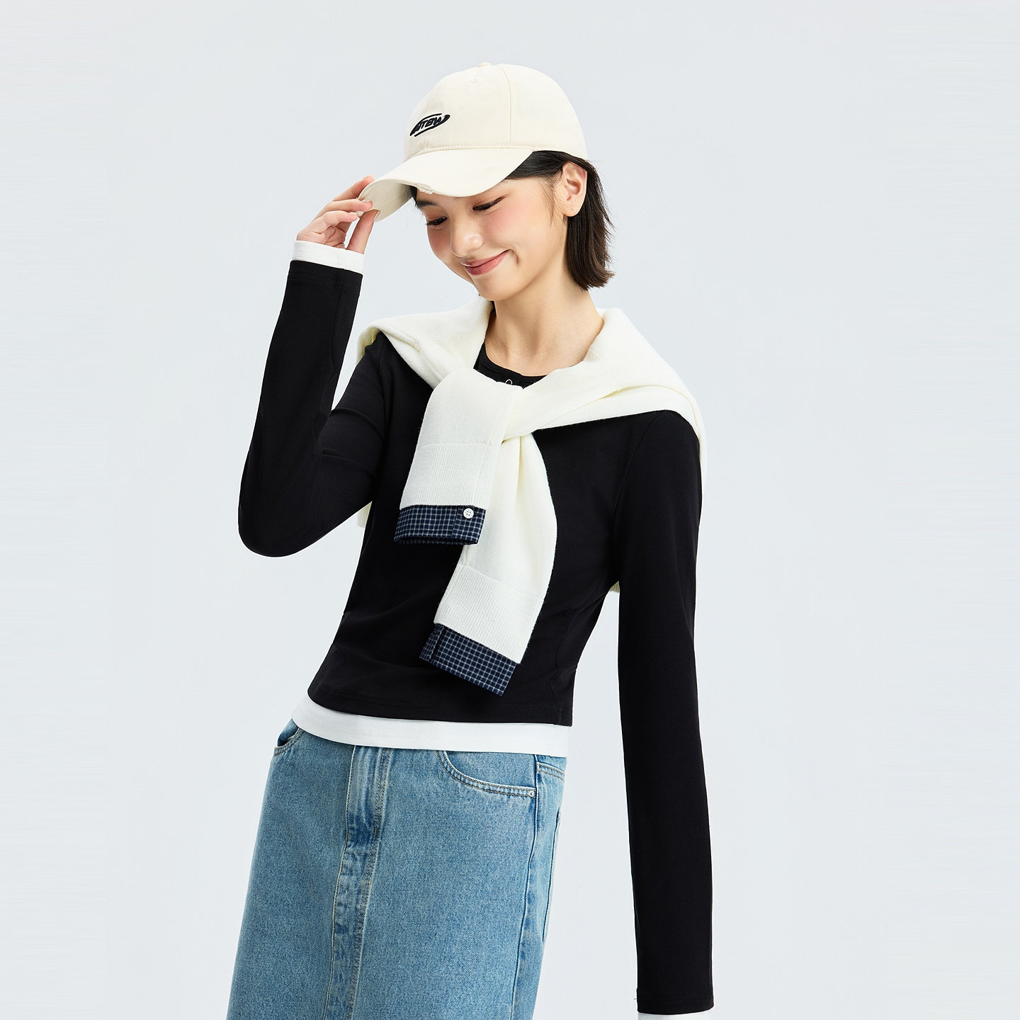 蕉下亨利衫女长袖T恤v领秋冬修身保暖低领打底衫半开领白色上衣