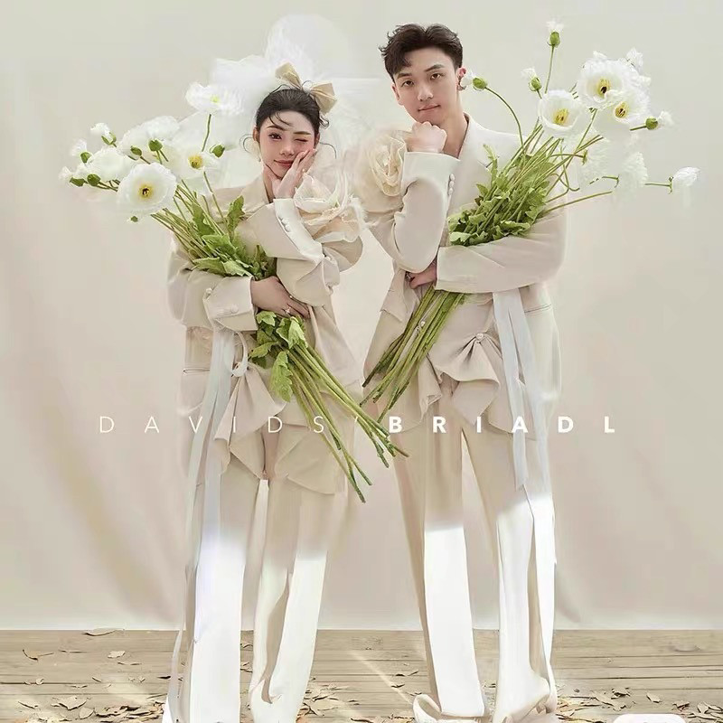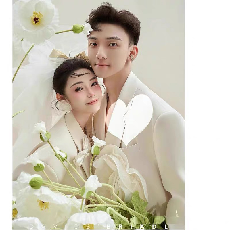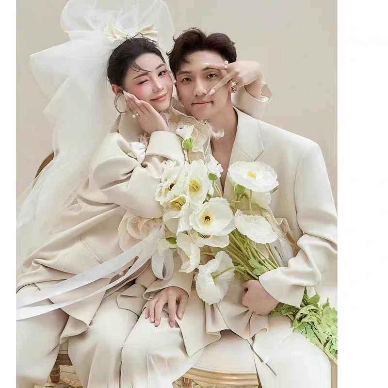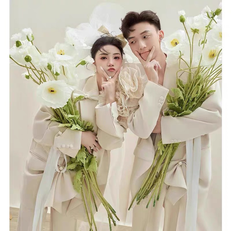 时尚杂志风室内婚纱照情侣写真超大头白罂粟花仿真花婚纱摄影道具