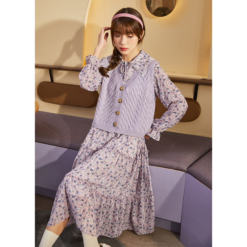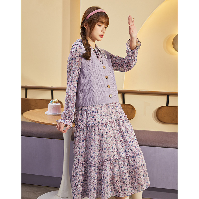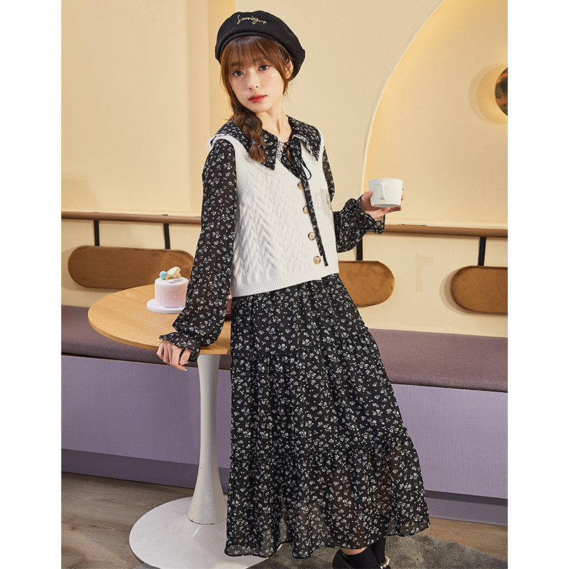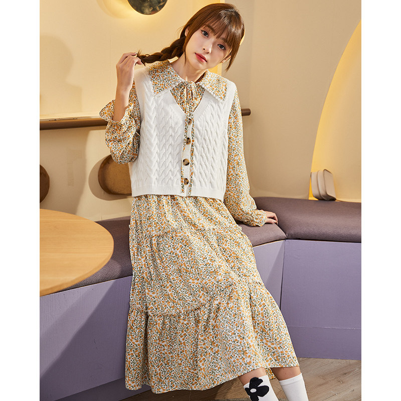 唐狮茶歇法式连衣裙子女春秋新款气质轻熟中长款子碎花裙马甲