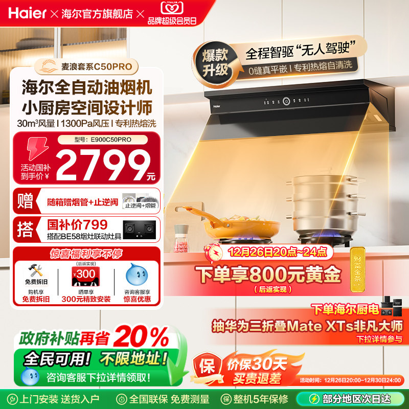 海尔麦浪全自动C50Pro吸抽油烟机家用厨房大吸力小红花静音油烟机