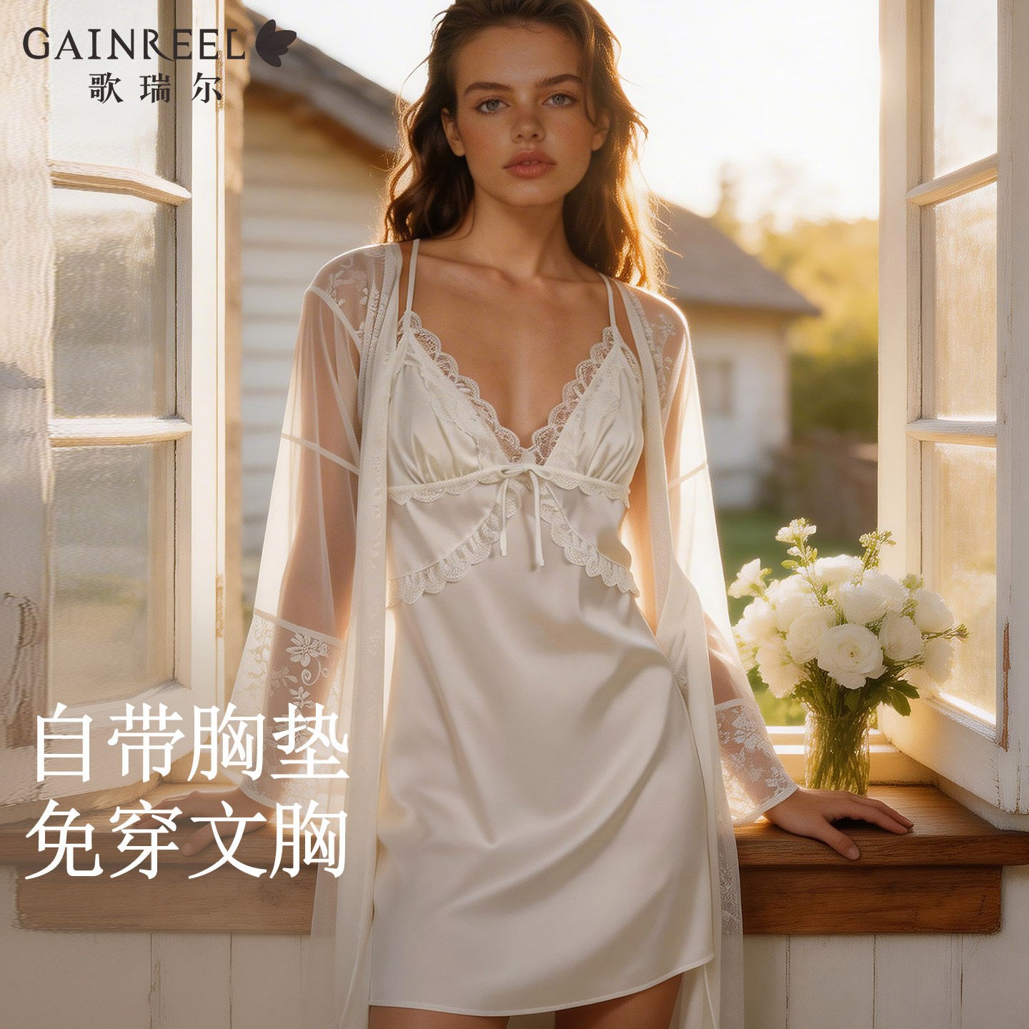 歌瑞尔性感深V蕾丝吊带睡裙女带胸垫法式纯欲美背睡衣新款家居服