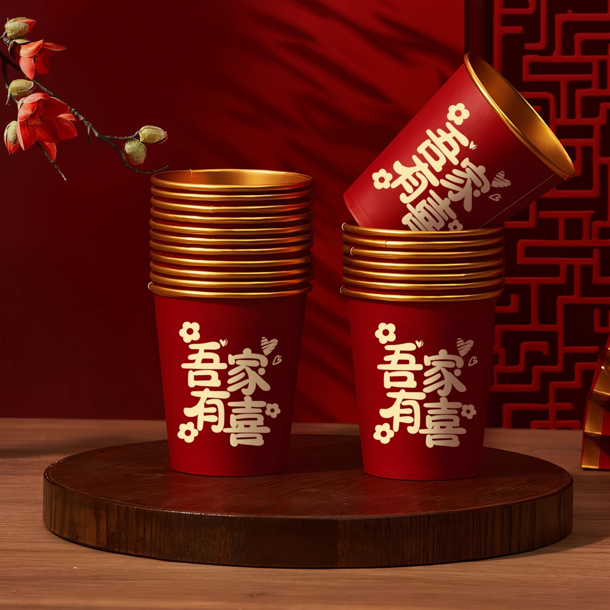 新款一次性纸杯结婚加厚水杯子家用婚礼红色金箔婚庆敬茶订婚整箱