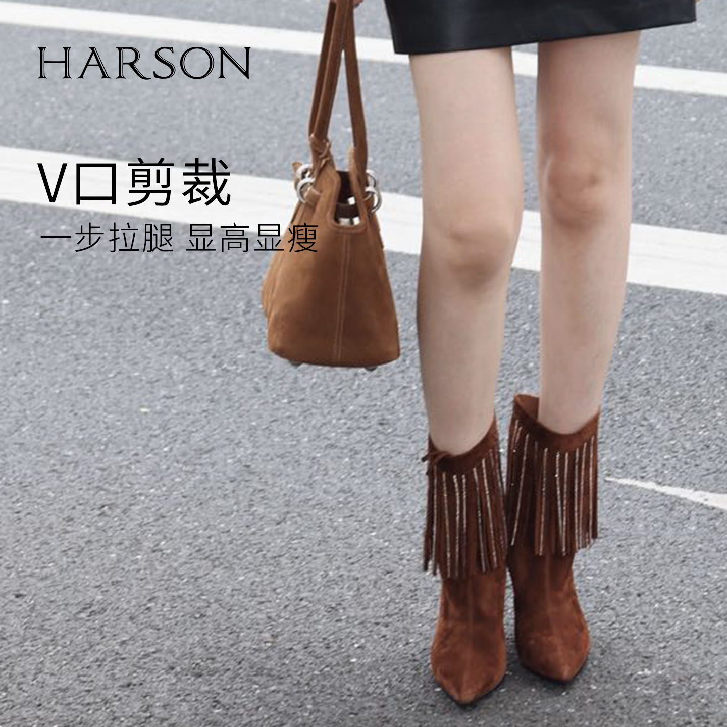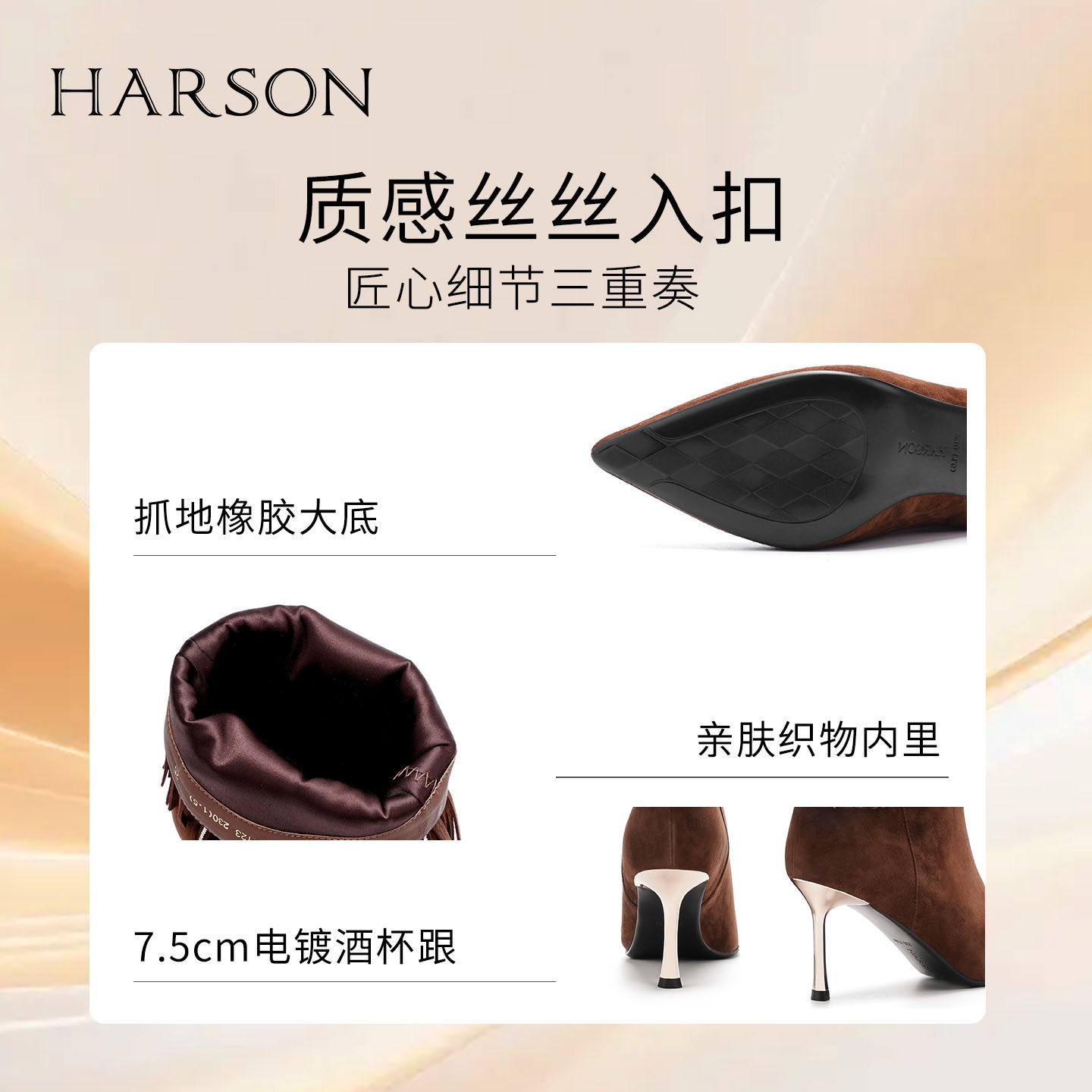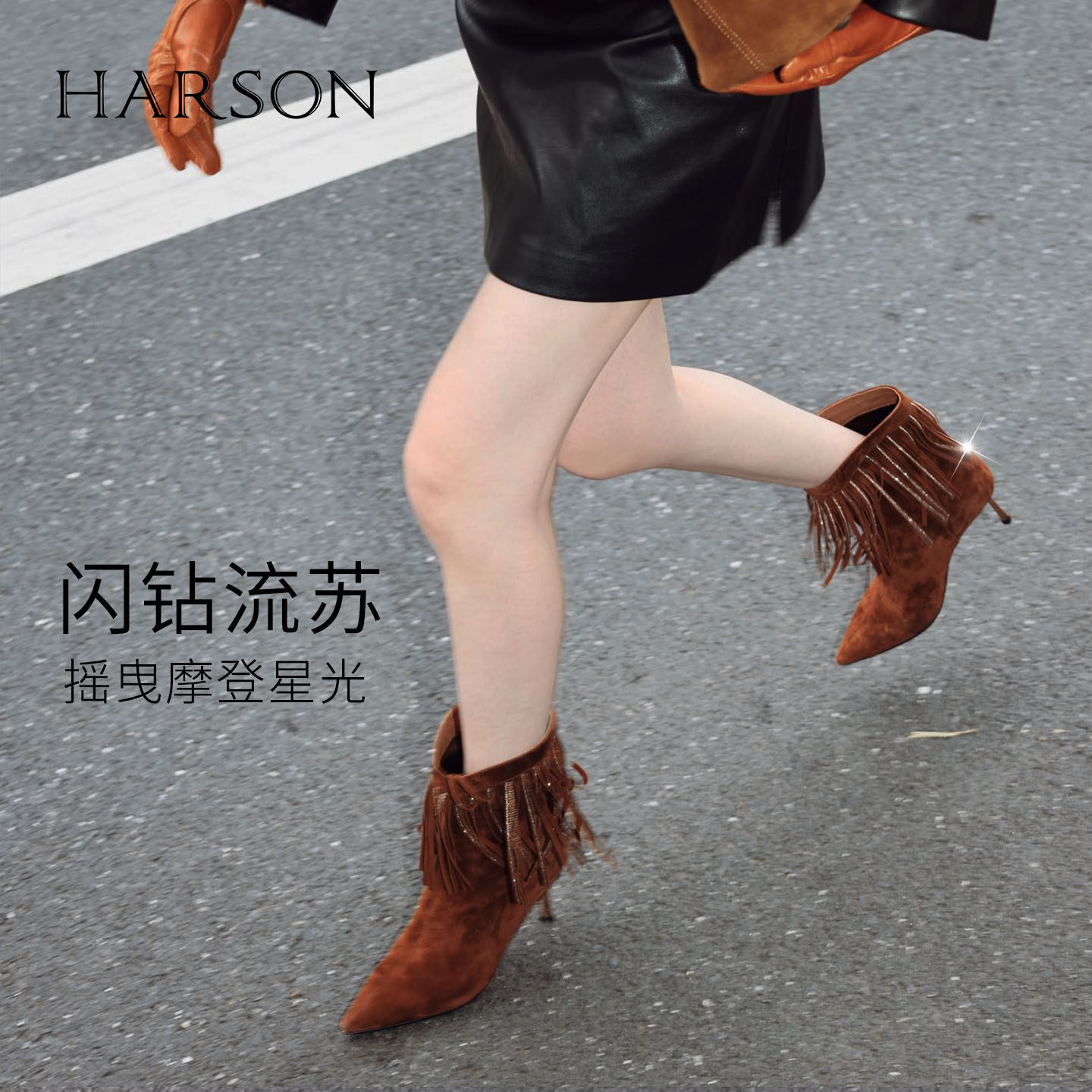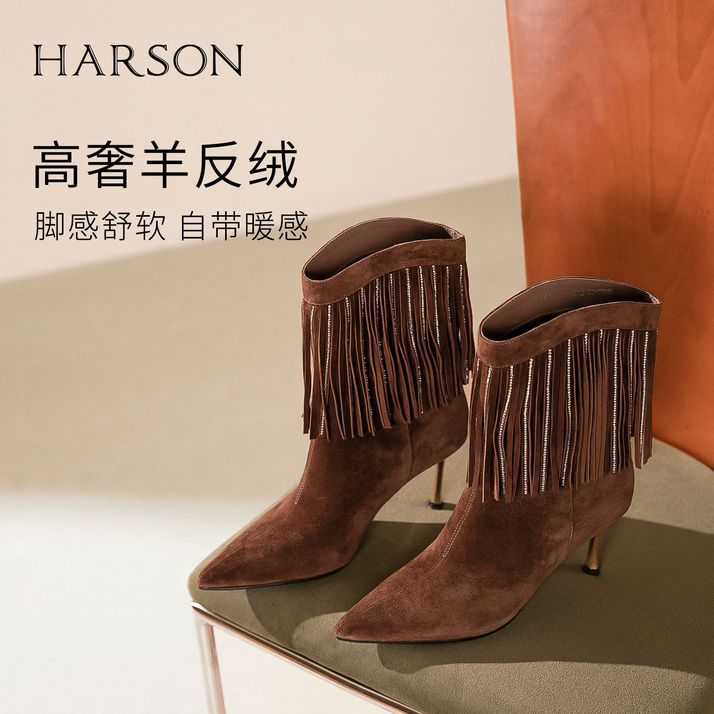 哈森气质尖头绒面闪钻流苏时装靴细高跟女中靴2025冬新款HA257123