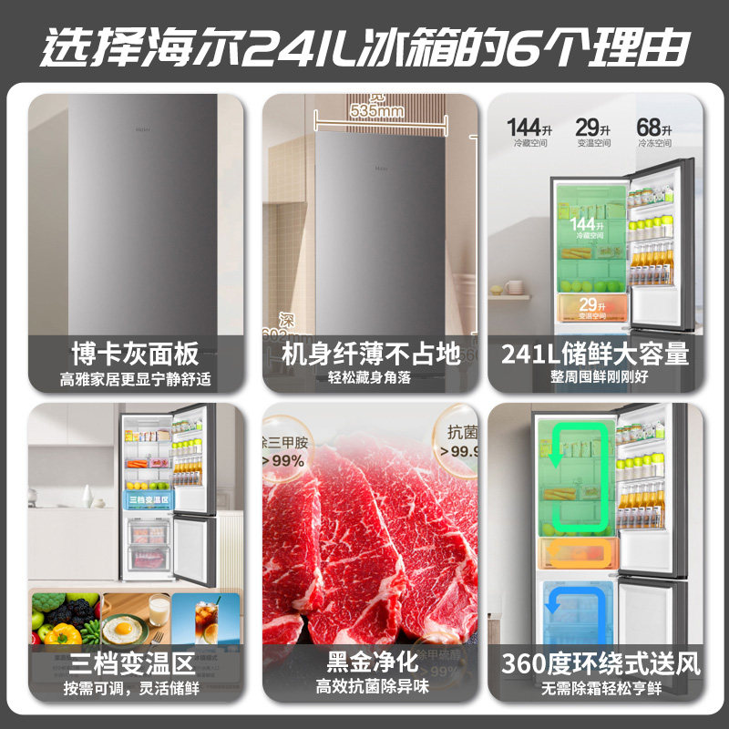 【新品】海尔冰箱241升上下双开门一级变频无霜深冻小型官方正品