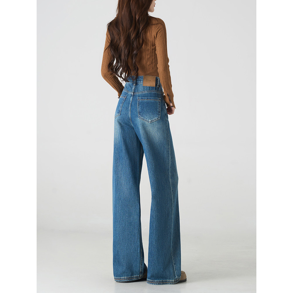王家有鱼秋季新款2025复古蓝微喇牛仔裤中高腰不贴腿显瘦裤子女款