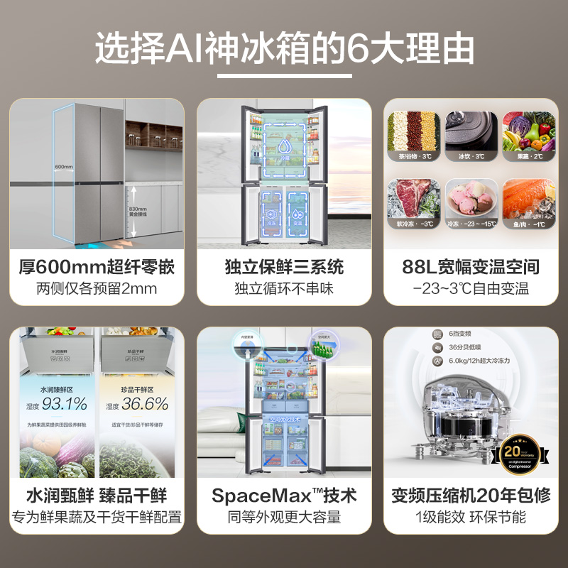 三星AI神8系501L三系统超薄嵌入式十字门冰箱国家补贴灰色5131QQ